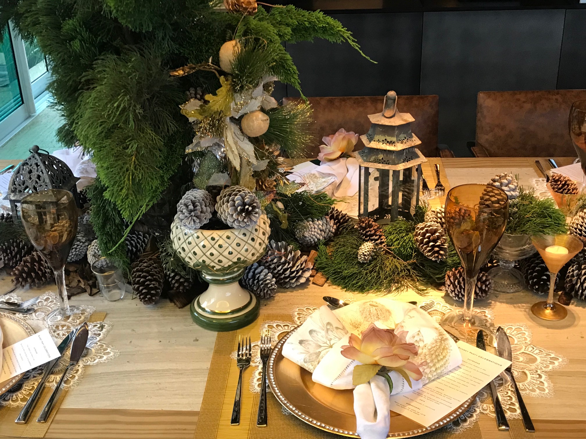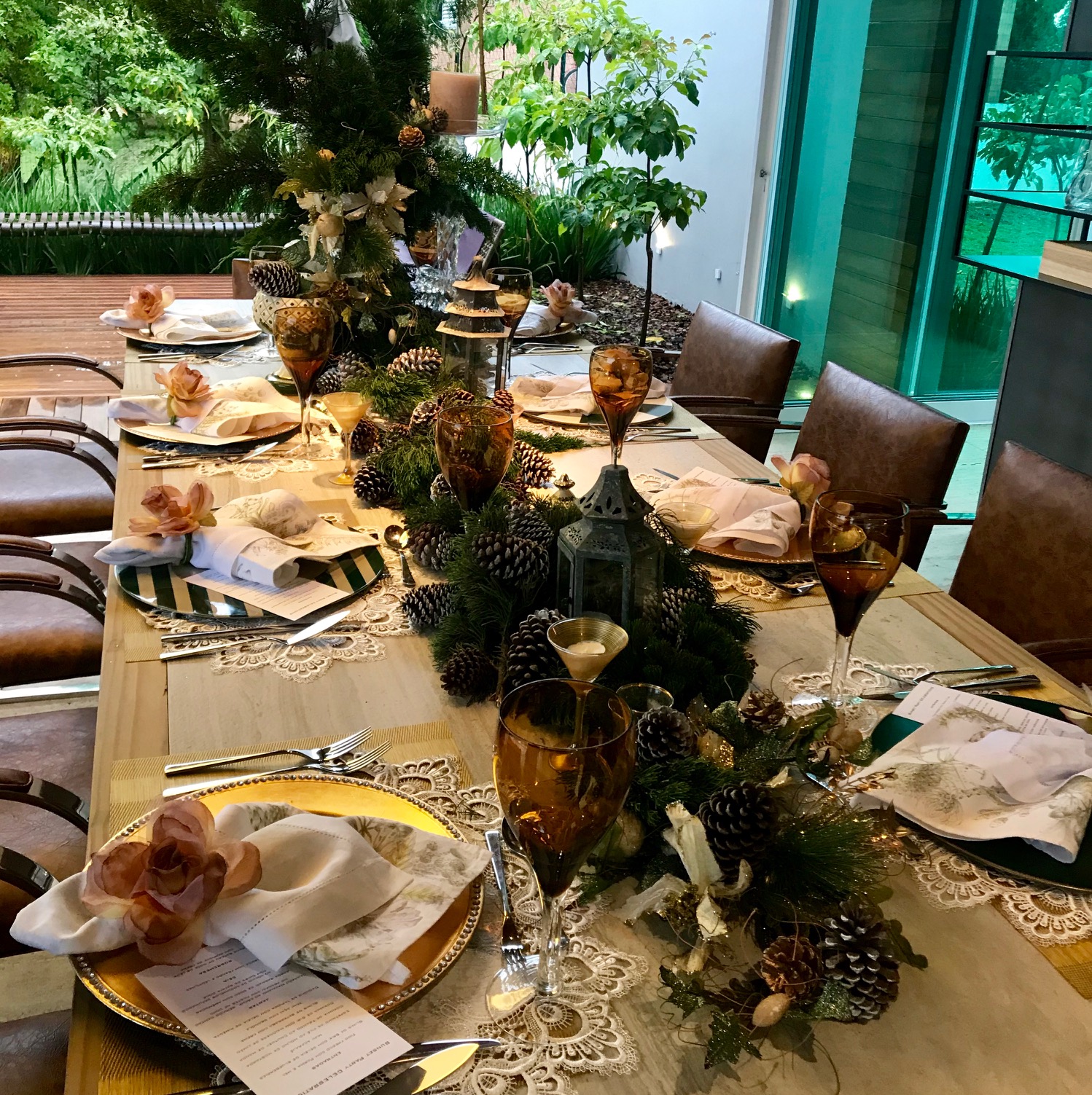 A outra mesa era em tons de dourado, já em sintonia com as bolas gigantes que ela mesmo fez para seu pinheiro do jardim.