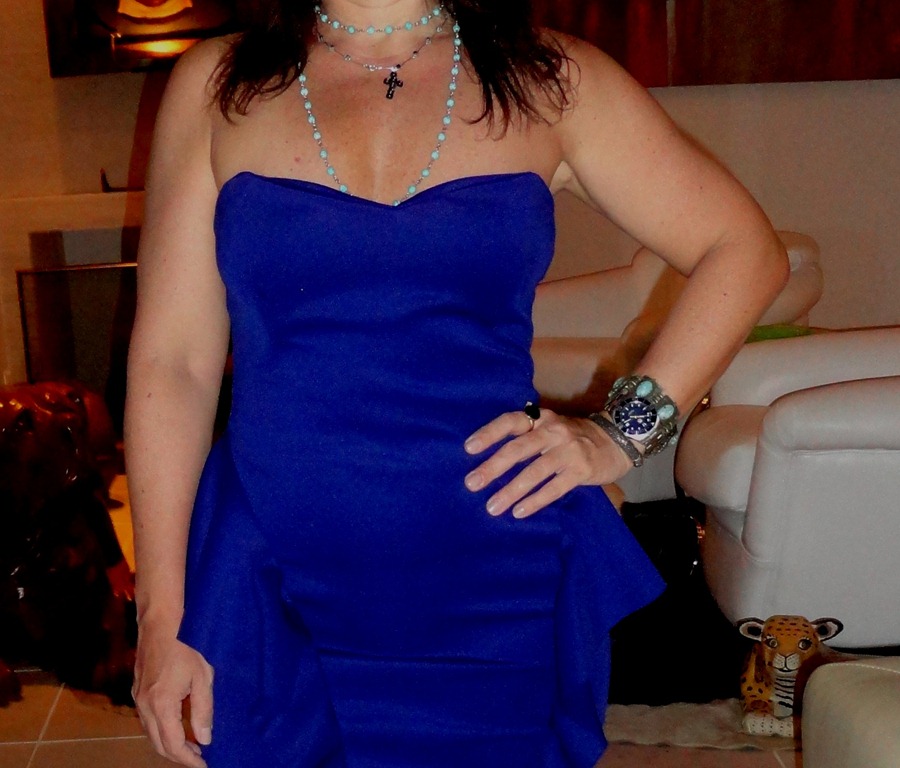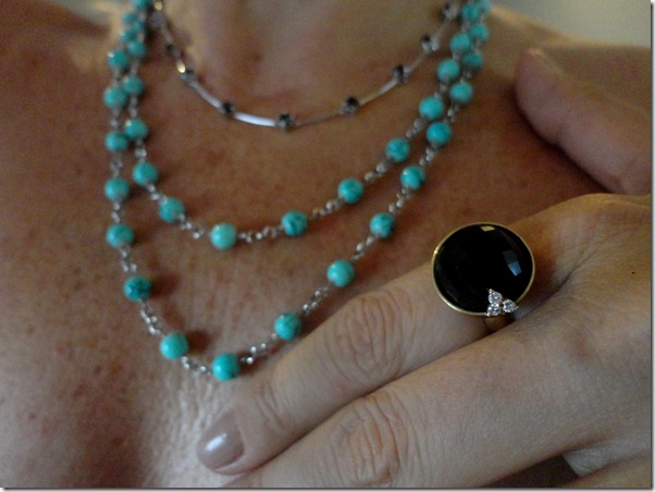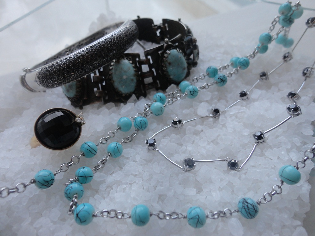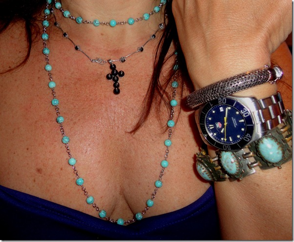 O azul bic do vestido foi “ quebrado “ por preto e turquesa . A pulseira em prata antiga é super vintage .O anel de ônix mais o colar e o bracelete de brilhantes negros jogaram super bem com ela, pelo tom mais escuro da prata de lei .