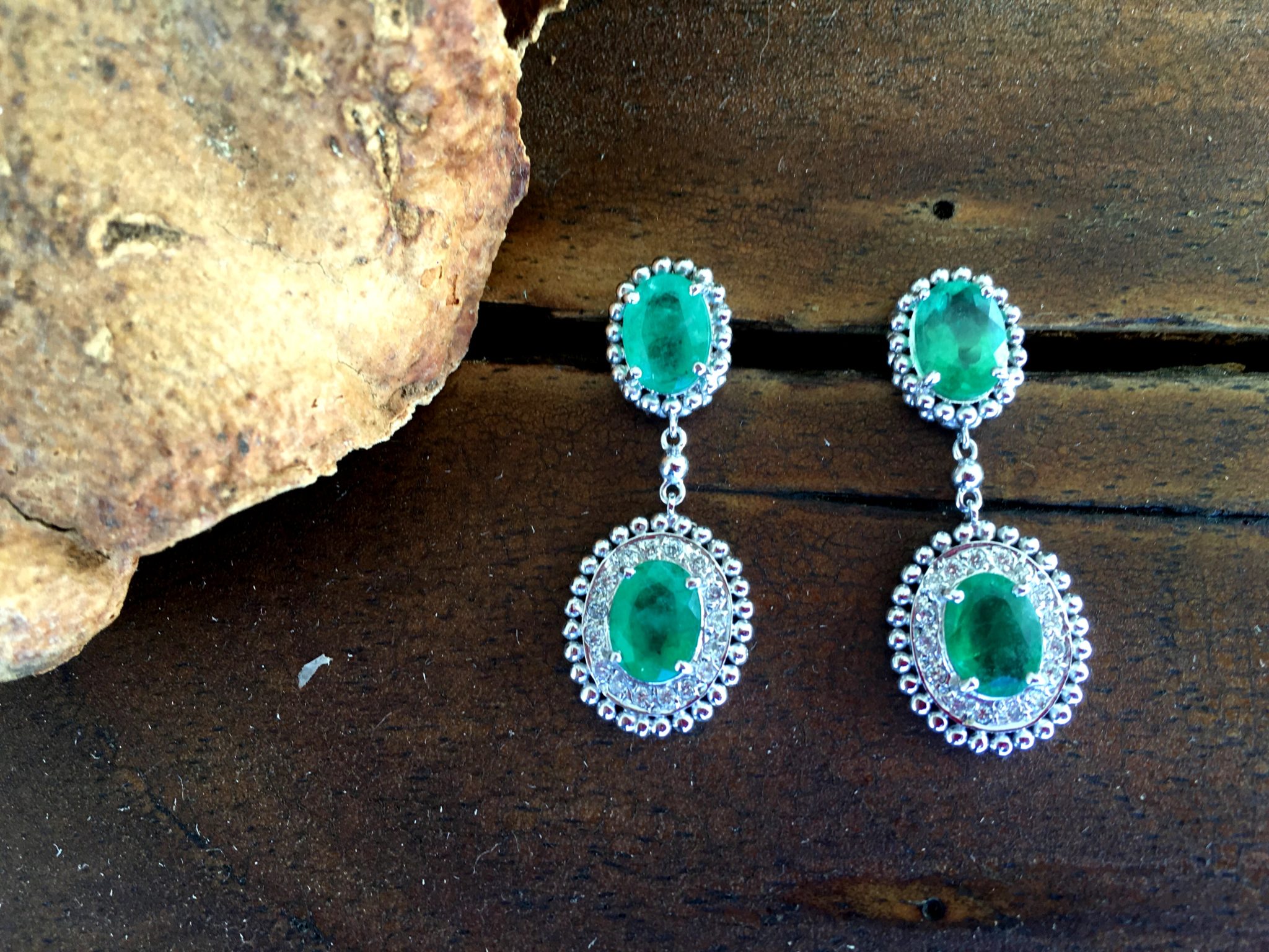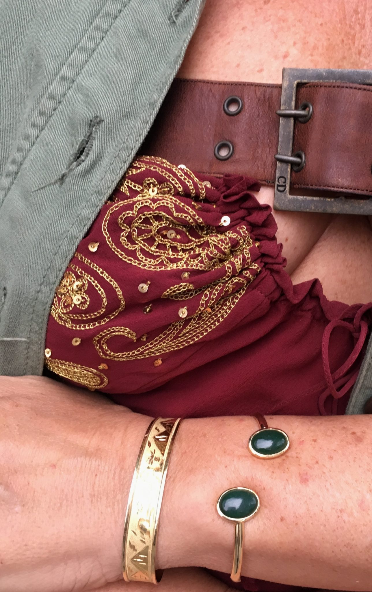 Usei com brinco de esmeralda e braceletes rígidos. Jóias com desenho limpo, trazendo um pouco do verde do look.
