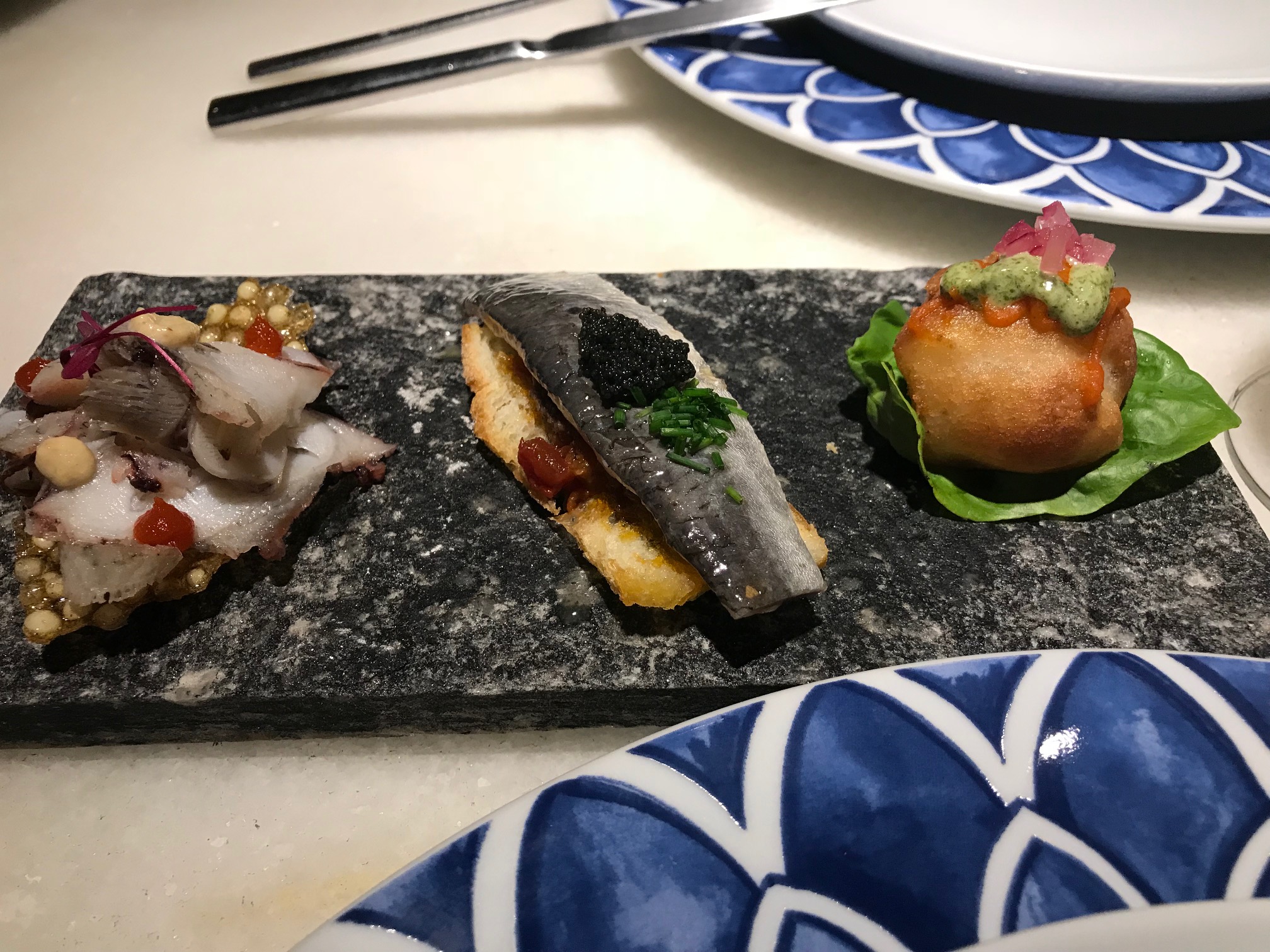 1 – Trilogia: sardinhas marinadas, bacalhau albardado, laminado de polvo – Vinho: Esporão Colheita branco