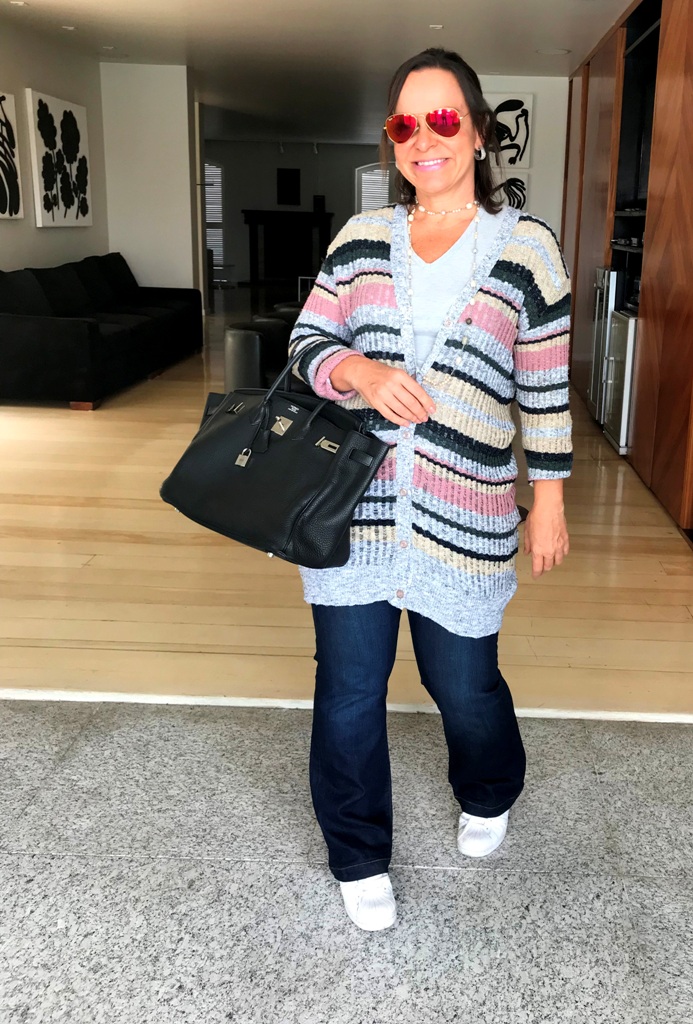 O meu dia-a-dia é bem informal. Como eu tenho essa possibilidade de trabalhar sempre de sapato baixo, eu abuso mesmo do conforto. Só que eu procuro estar “confortável com twist”. RSRS