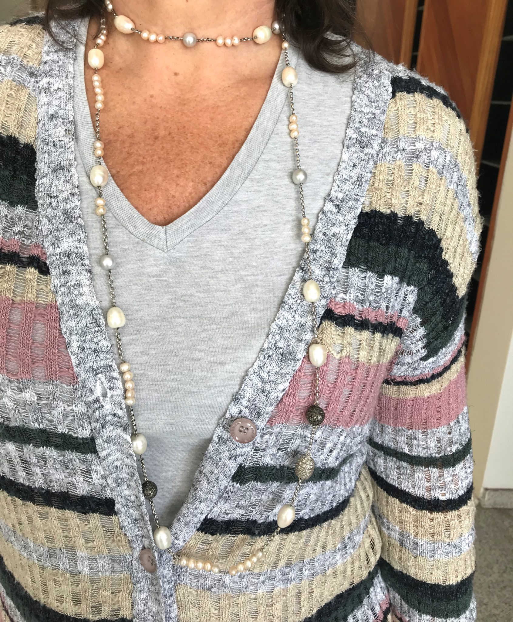 São peças-coringa. O fio pode também ser enrolado em 3 voltas e ficar rente ao pescoço. Pode ser misturado a outros fios – veja AQUI . São muitas as possibilidades! Com a argola acontece o mesmo. Ela tem um tamanho interessante, tem volume e brilho. Sai bem de dia e de noite, aceitando várias composições.