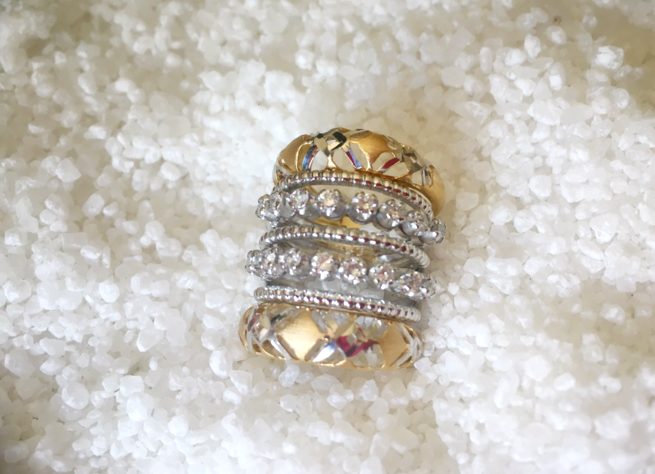 Uma mãe queria presentear sua filha no dia do seu noivado com algo simbólico, mas não queria concorrer com o noivo. Decidiu então por uma meia-aliança dupla em brilhantes e um par de aparadores em ouro amarelo.