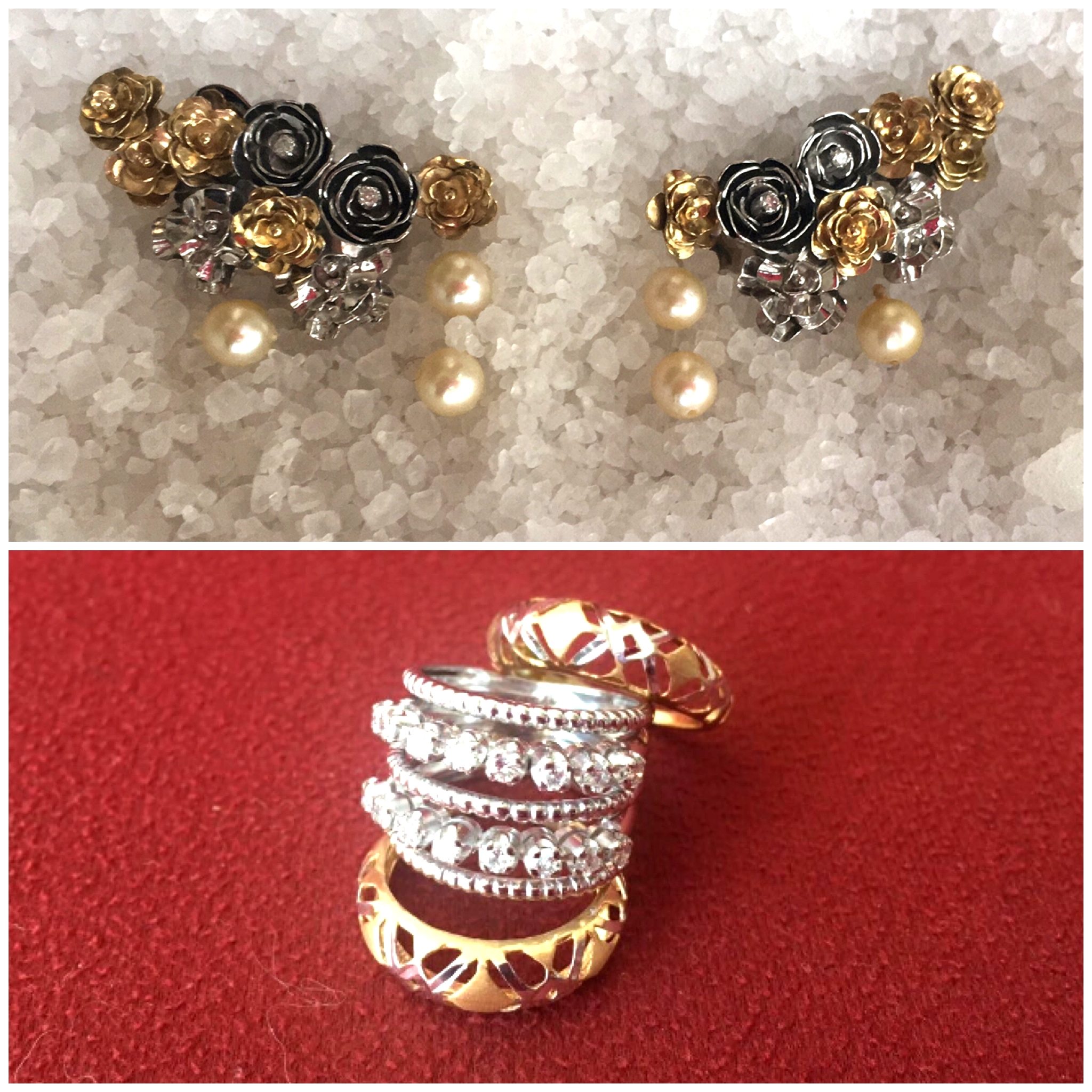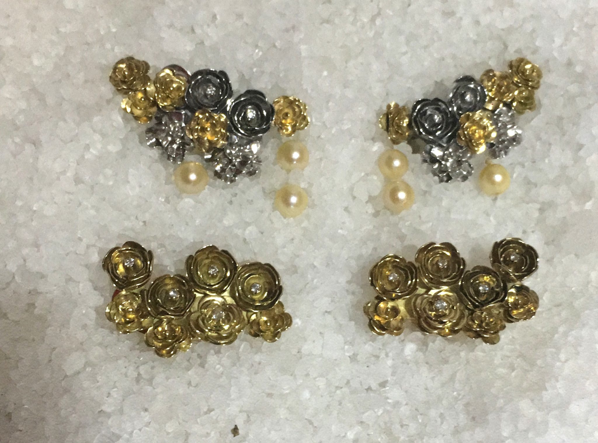 Além disso, ela tinha umas pérolas para aproveitar e pensou em um brinco delicado também em 2 tons de ouro, pois o vestido do noivado era bordado em mini-pérolas. A partir desse earcuff de rosas, pensei em fazê-lo em 2 tons e adaptar as mini-pérolas nas pontas. Tudo em comum acordo com o que a mãe tinha em mente para a filha querida.