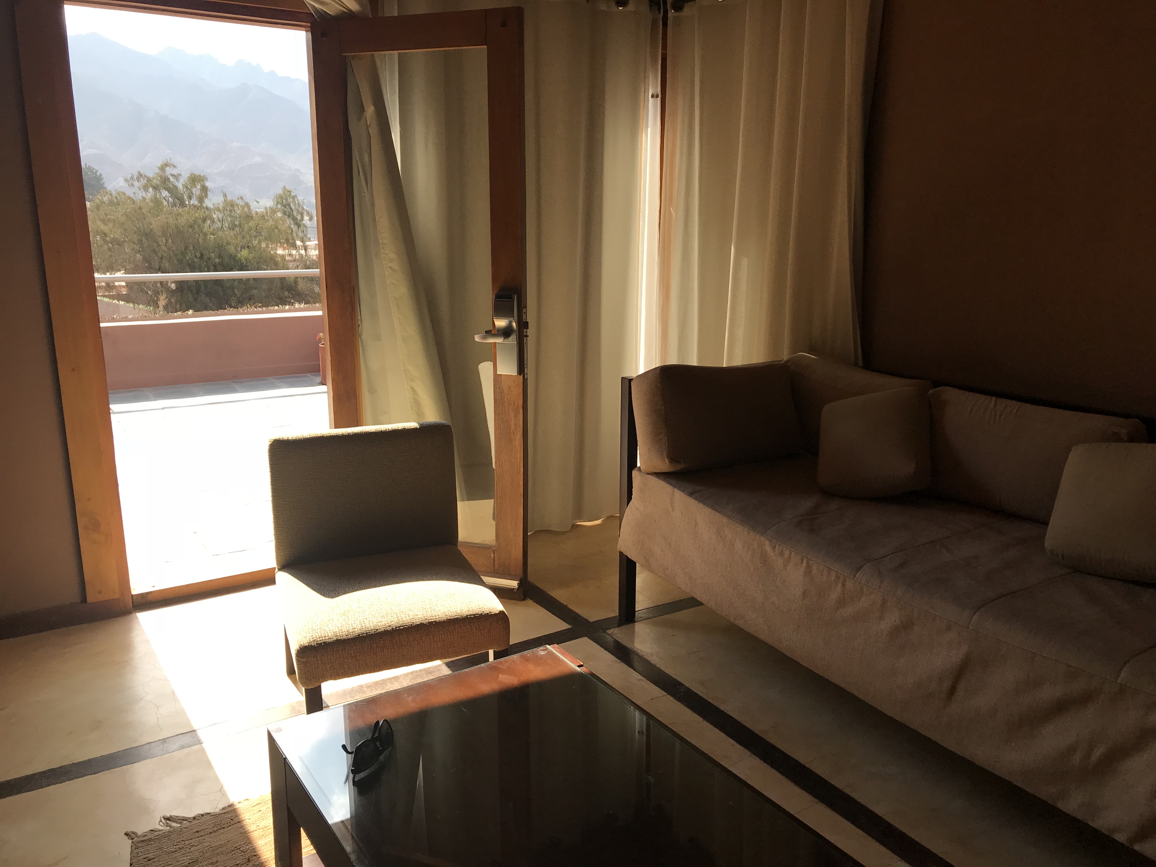 Paredes de pedra ou adobe, portas de cactos, tapetes de sisal. Tudo bem inserido no estilo local. A suíte gigantesca tem closet, banheira e essa sala que abre na varanda com vista para as montanhas.