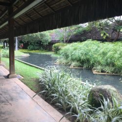 Essas varandas cobertas da foto abaixo circundam todos os 287 quartos, protegendo os hóspedes de chuva e sol. Crianças novas e idosos podem pedir quartos mais próximos dos restaurantes ou usar o carrinho de golfe.