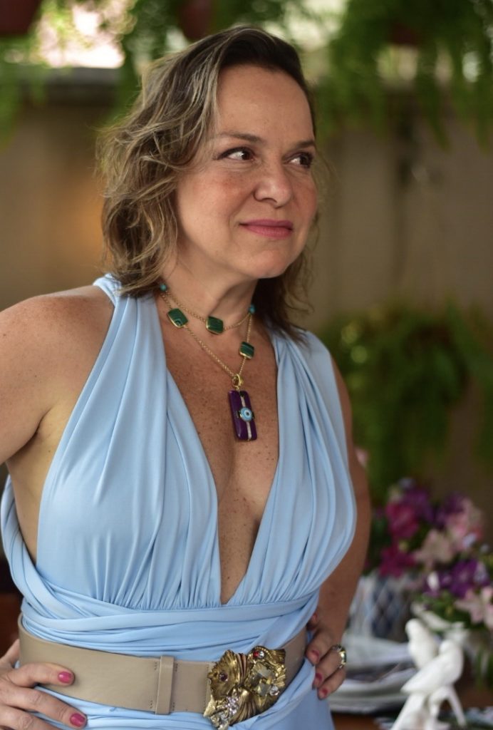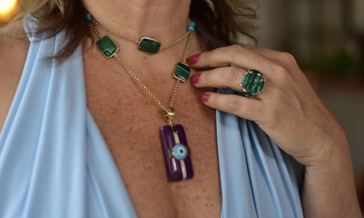 Escolhi usar o fio em 2 voltas com pingente, não só para valorizar o decote, como também para mostrar bem as peças. Além disso, usei também o anel em turmalinas verdes e malaquita, a mesma pedra do fio.