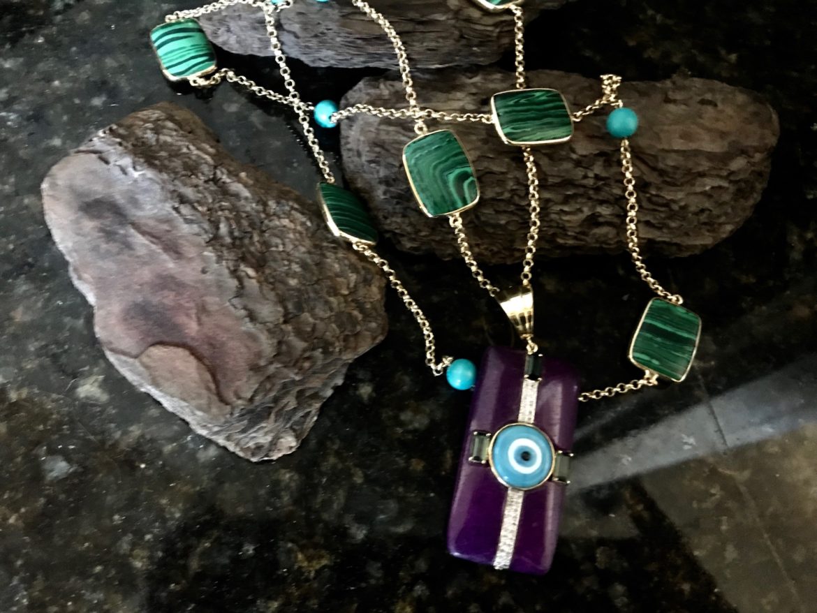 Combinei com joias bem coloridas. O fio em malaquitas e turquesas é bem versátil, pois pode ser usado sozinho bem longo, ou em 2 voltas, com pingente ou sem. Já mostrei outras formas de uso AQUI .
