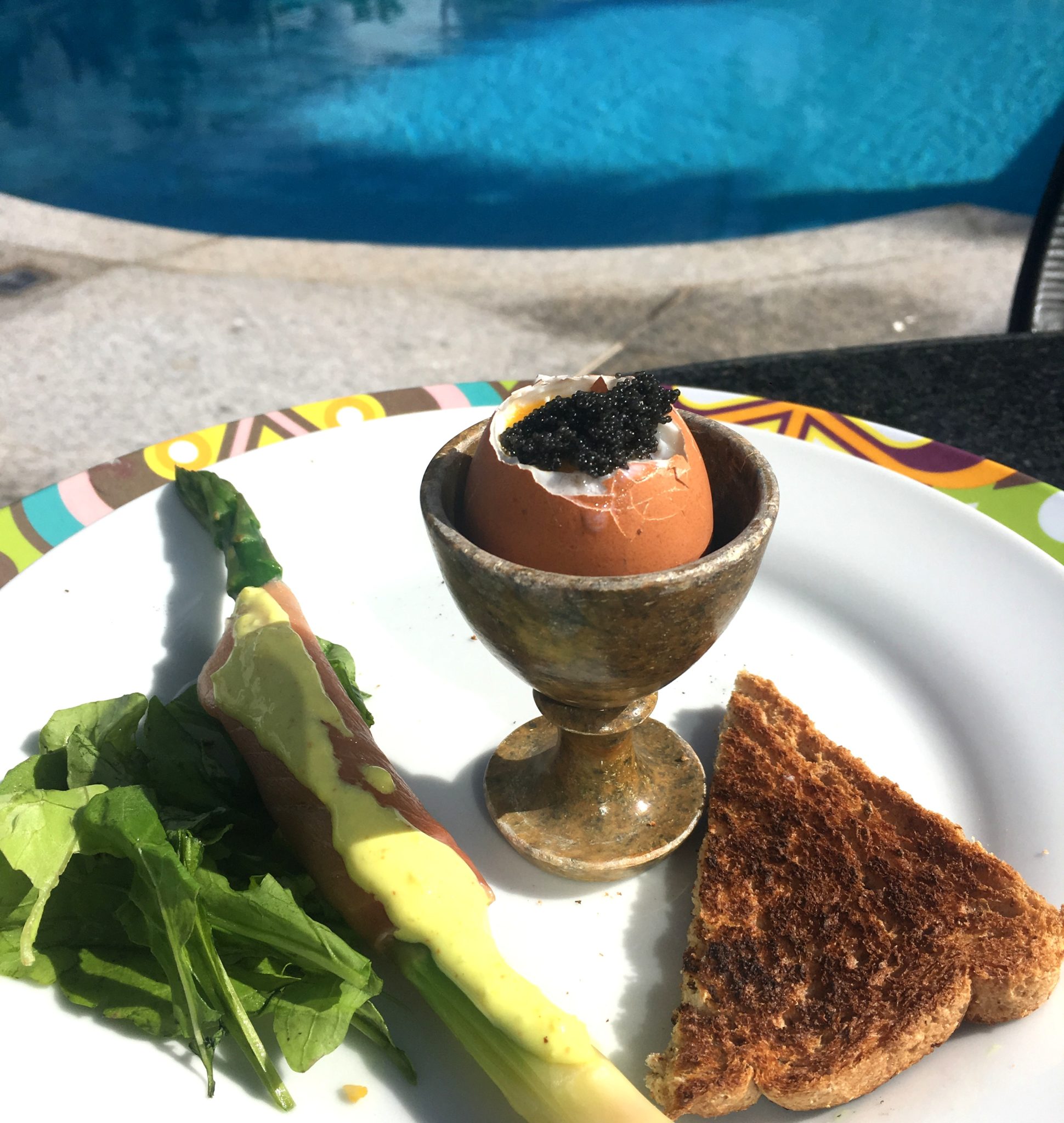 OVOS QUENTES COM OVAS, SALMÃO DEFUMADO E ASPARGOS