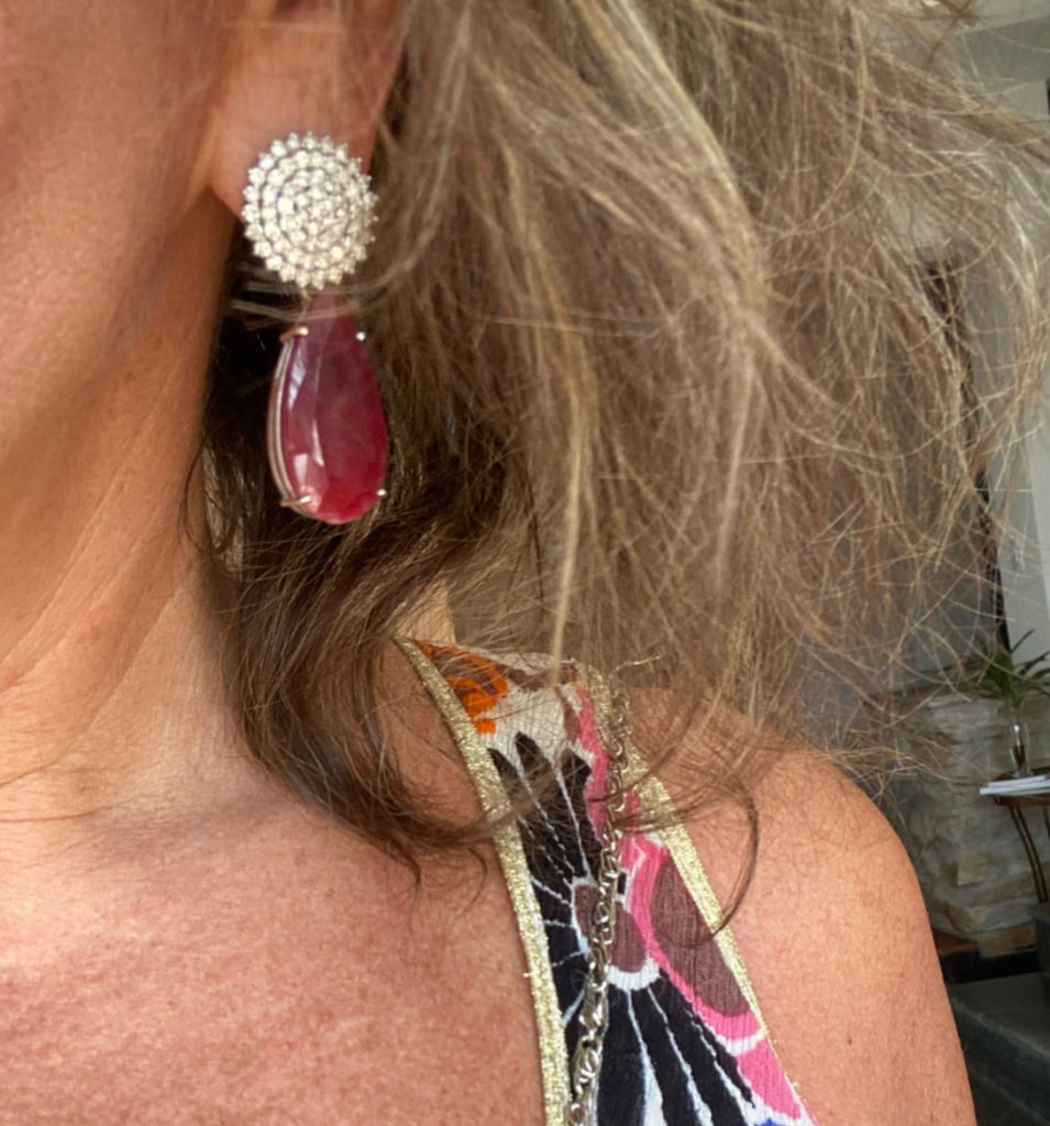 Com esse look tão ousado e essa make mais ainda, escolhi usar apenas uma joia: o brinco de rubis e brilhantes. Nada mais, cores nem mesmo na bolsa e sapato. Aliás, essa é uma dica: quando ousar em um ponto, compense no resto.