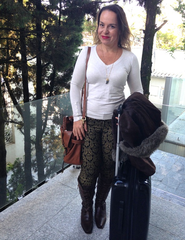 Meu look, com calça em estampa brocada com stretch ( item importante!), blusa de malha ZARA, as botas baixissimas CLÔ , a bolsa maior MULBERRY que será usada todos os dias e o casaco na mão, tanto para o frio do avião , qto para chegar no frio de NY. De jóia só o colar – não precisa ser retirado para dormir e nem apita na detector. E dá um toque , né, gente?