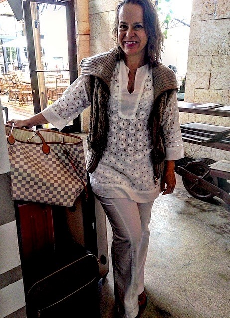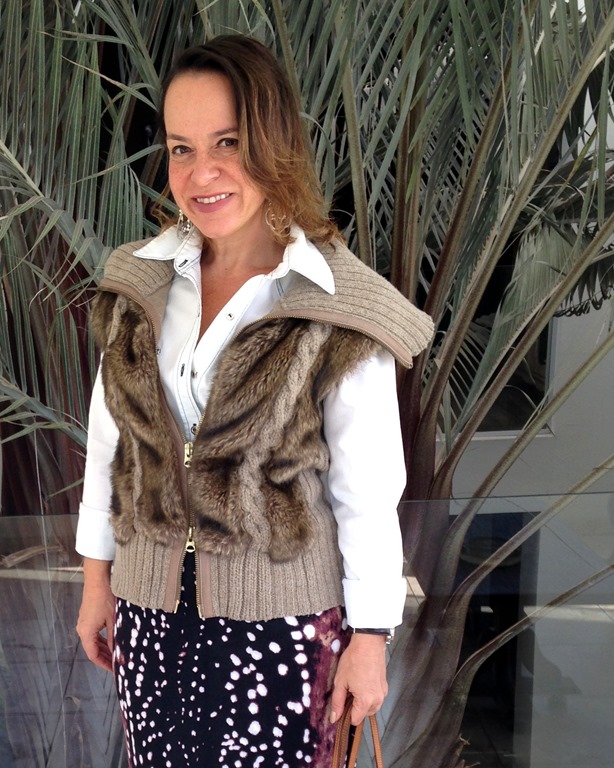 camisa jeans IORANE – saia TAHARI – colete ARMANI EXCHANGE – flats PRADA -bag LOUIS VUITTON ( a mesma que seria usada todos os dias e também na praia )