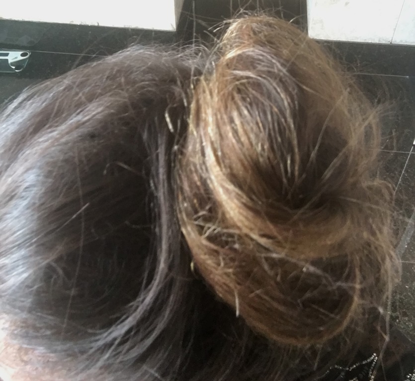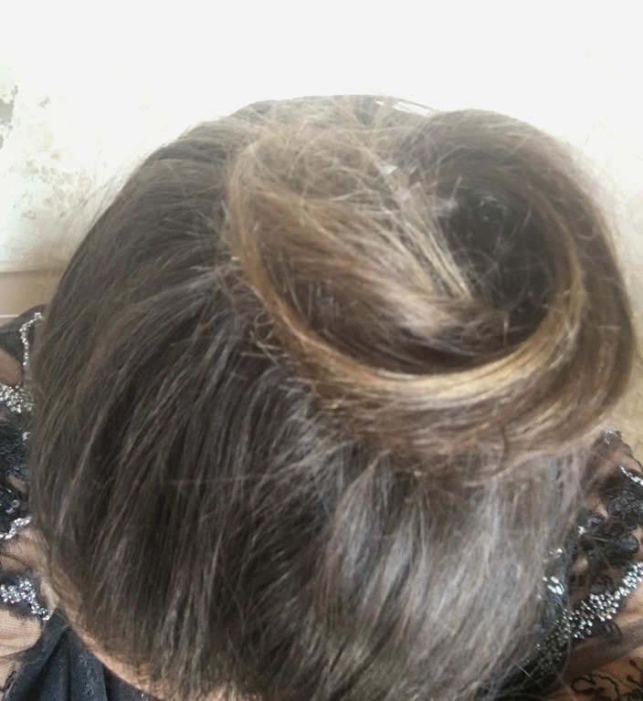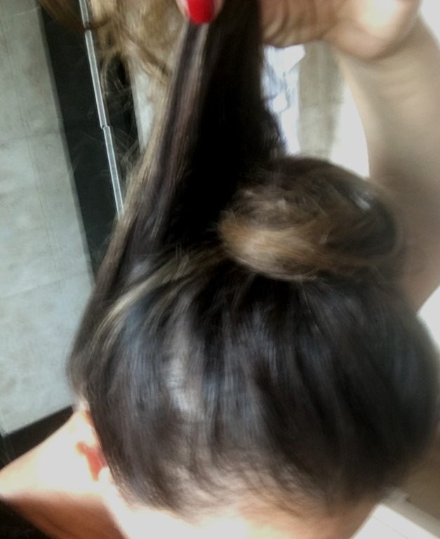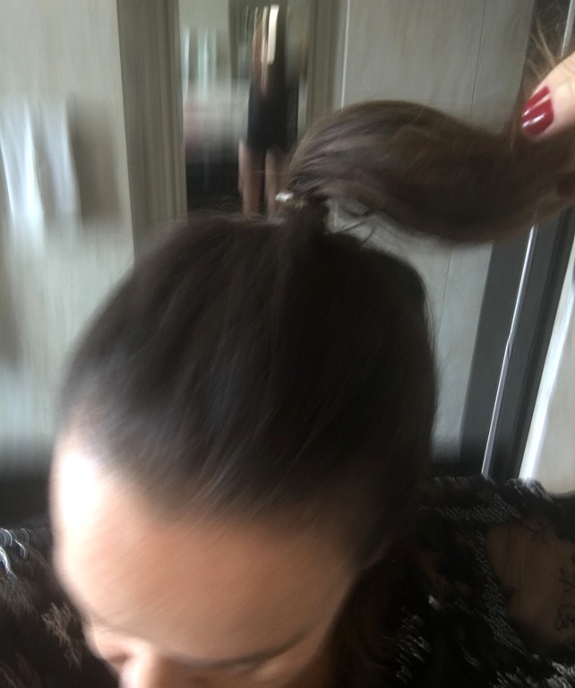 2) depois, separo uma mecha da parte de cima, prendo com elástico apertado e rodo um coque em volta desse rabo bem alto. Prendo com grampos.