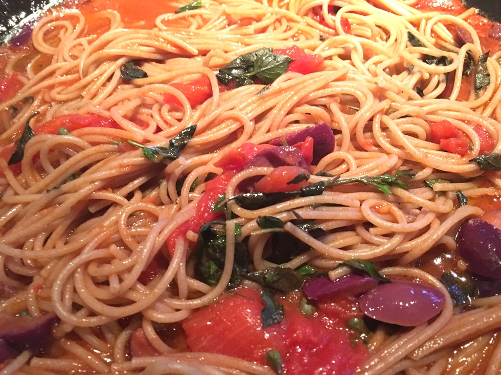 INGREDIENTES: 300 g de espaguete ( prefiro integral ou sêmola ) – 100 ml de azeite – 12 azeitonas pretas picadas – 4 dentes de alho picados – 20 tomates cereja cortados ao meio ou 1 lata de tomates pelados (cortados ao meio – usar o suco ) – 150 ml de vinho branco seco – 1 colher de sopa de mini-alcaparras ( ou parta as grandes ao meio ) – manjericão fresco a gosto – 6 filés de aliche picados – pimenta calabresa seca a gosto