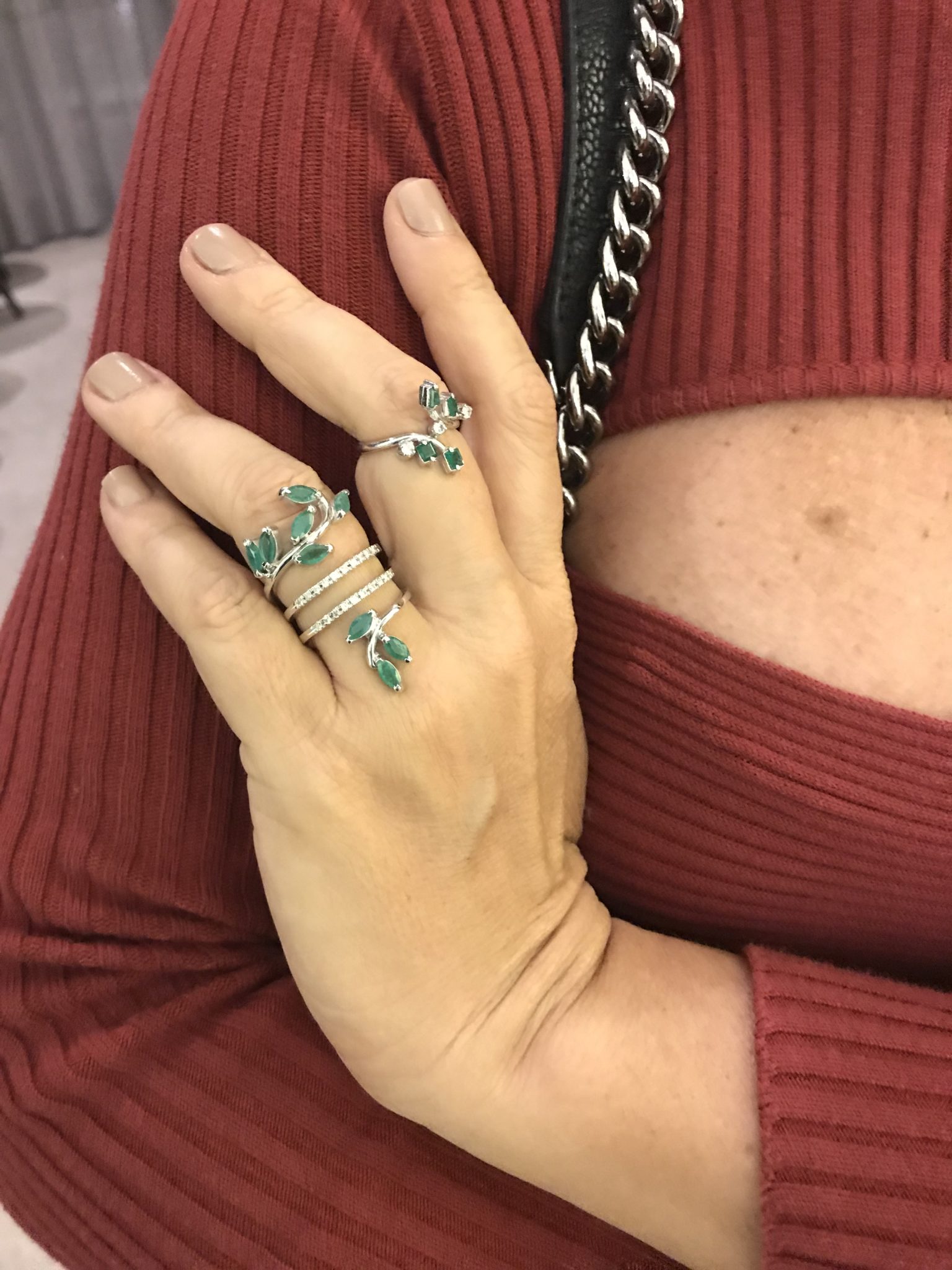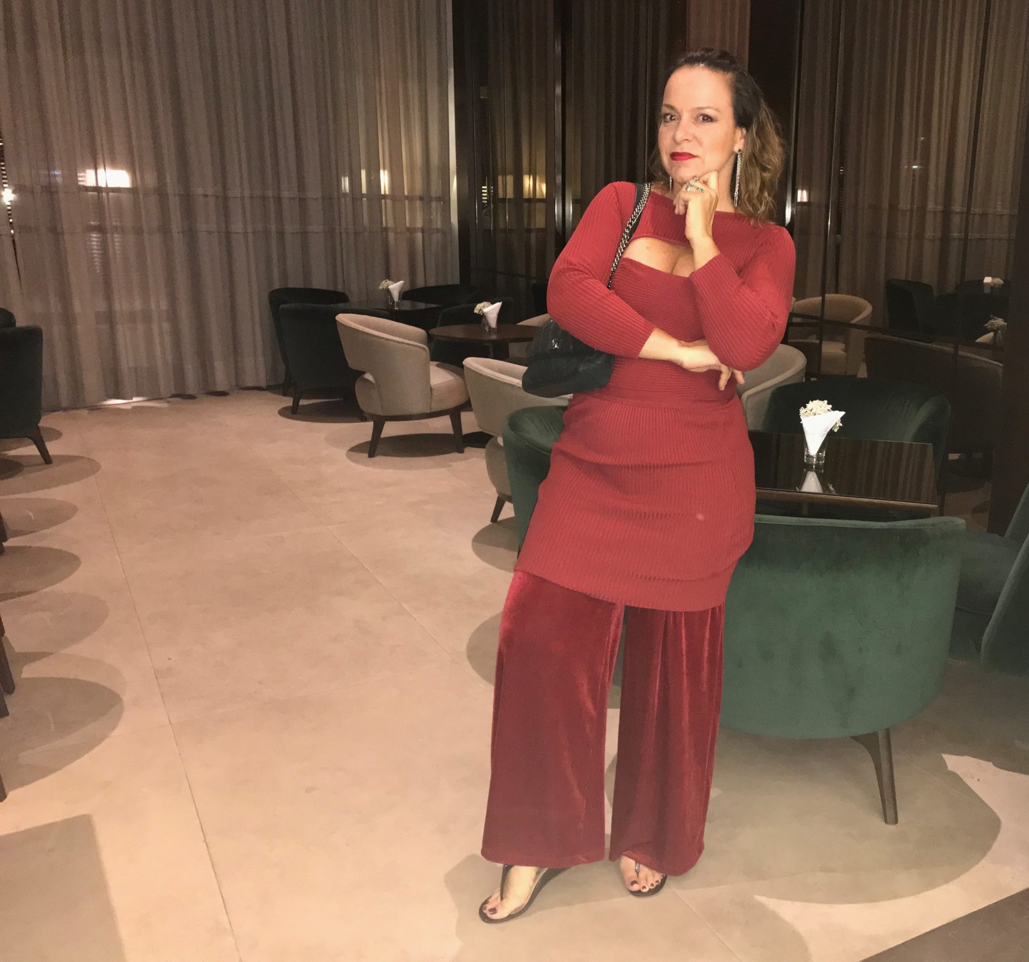 Lembra do vestido sob o casaco? Dessa vez, usei com pantalona, tudo bordô. Jóias em verdes.