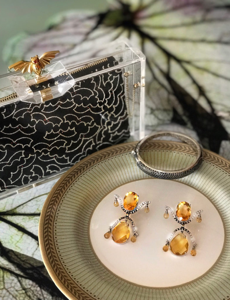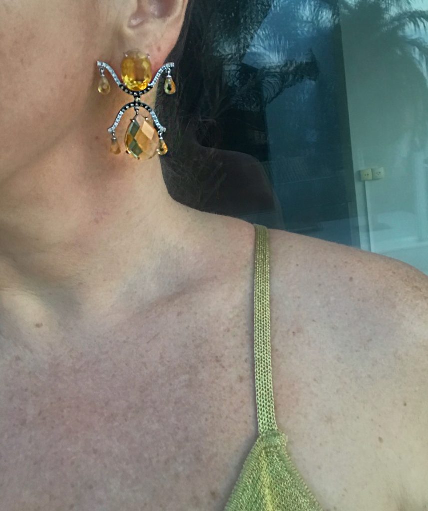Nessa festa, eu prendi o cabelo para trazer um pouco mais de glamour e usei joias em citrine e brilhantes negros, que conversavam bem com a clutch CHARLOTTE OLYMPIA .