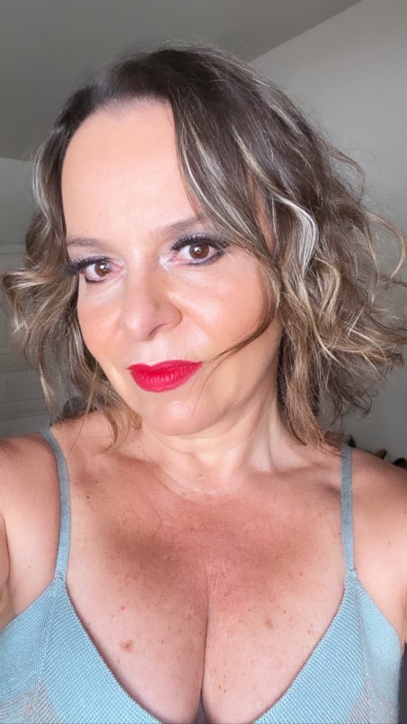 Eu sou uma pessoa que quando confio na competência da profissional, eu me jogo. Ela então me propôs uma make roxa pelas mãos de VANESSA CARVALHO e o cabelo foi frisado estilo anos 90.
