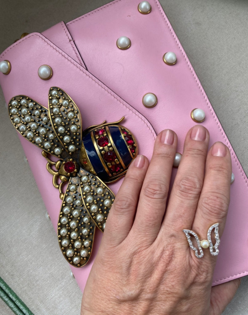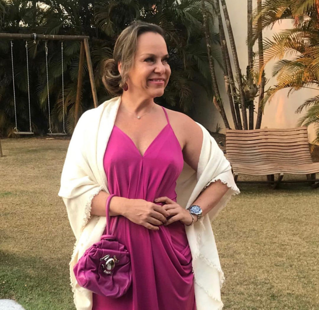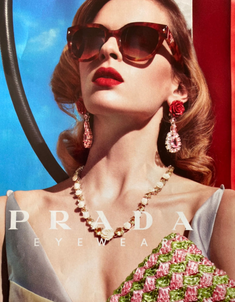 A inspiração de ontem foi esse look PRADA . Usei então um vestido de lures azul-acinzentado da TAHARI com bolsa rosa e joias em flores. Repare na boca vermelha da foto que reproduzi na minha make.