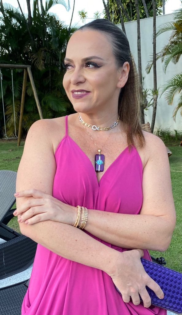 Joias em flores e acessórios bem coloridos e femininos compuseram esse look de verão.