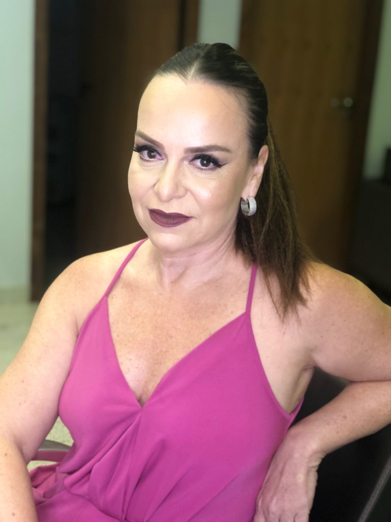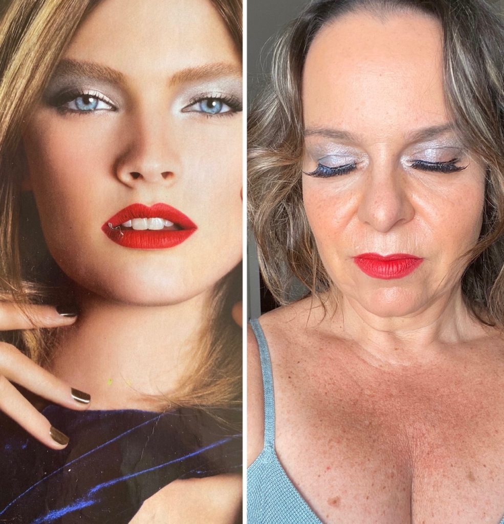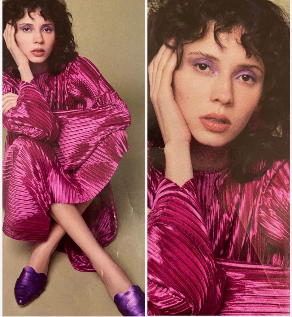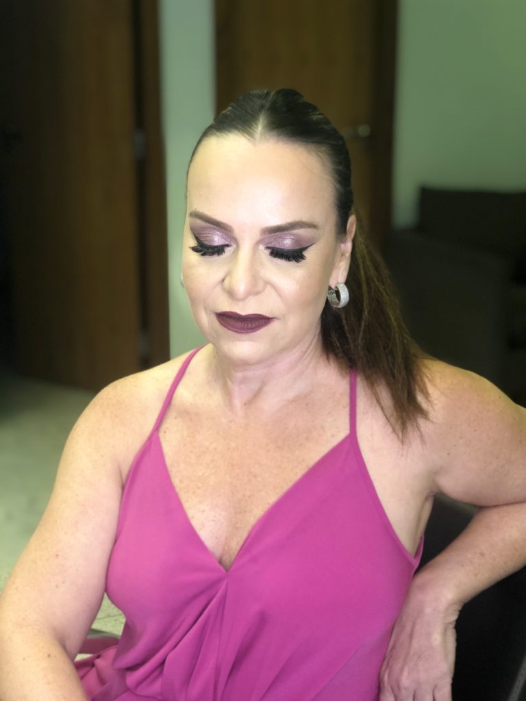 Eu já tinha usado esse vestido pink em uma outra situação de maneira bem feminina, inclusive no cabelo e na make e agora quis ousar . Mandei essa inspiração de pink com roxo para a visagista CLAUDIA GUIMARÃES e ela entendeu o look com anos 90 e me prôpôs um cabelo frisado como na inspiração abaixo.