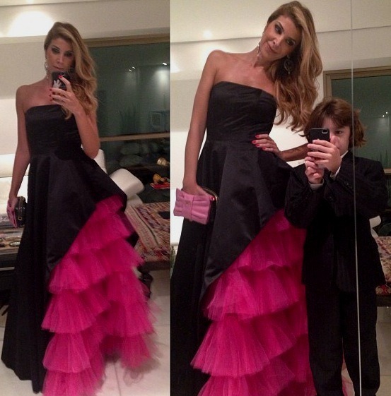 Aléxia estava em dia de DIVA – de longo preto e pink e brinco PATRICIA DIAS.