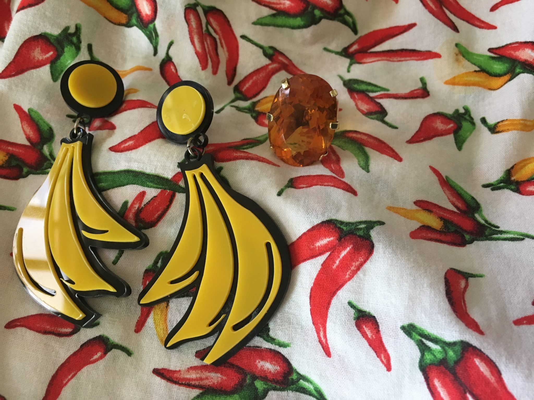 Acessórios divertidos e estampas de frutas e legumes: Esses brincos são A CARA do verão. Comprei bananas e usei com vestido de pimentas . Eu me divirto com a moda! Bora povo! Liberte a Carmen Miranda que habita em você! rsrs