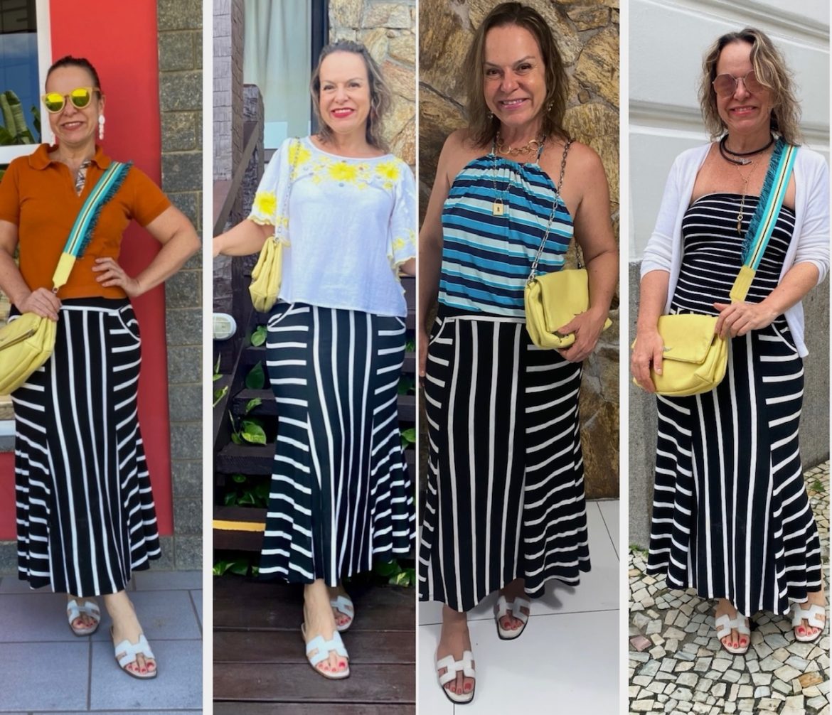 O bom da saia é que ela se multiplica muito mais do que um vestido, e ambos são frescos da mesma maneira. Mesmo não sendo lisa, como no caso dessa saia listrada de malha PB, dá para montar mil looks, desde que você se permita. Eu só consigo montar esse quebra-cabeça porque experimento tudo com tudo antes. E como faço com antecedência, dá tempo até de fazer pequenos ajustes para atualizar a peça( bainha, aperto, um elástico, etc etc )