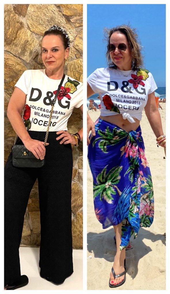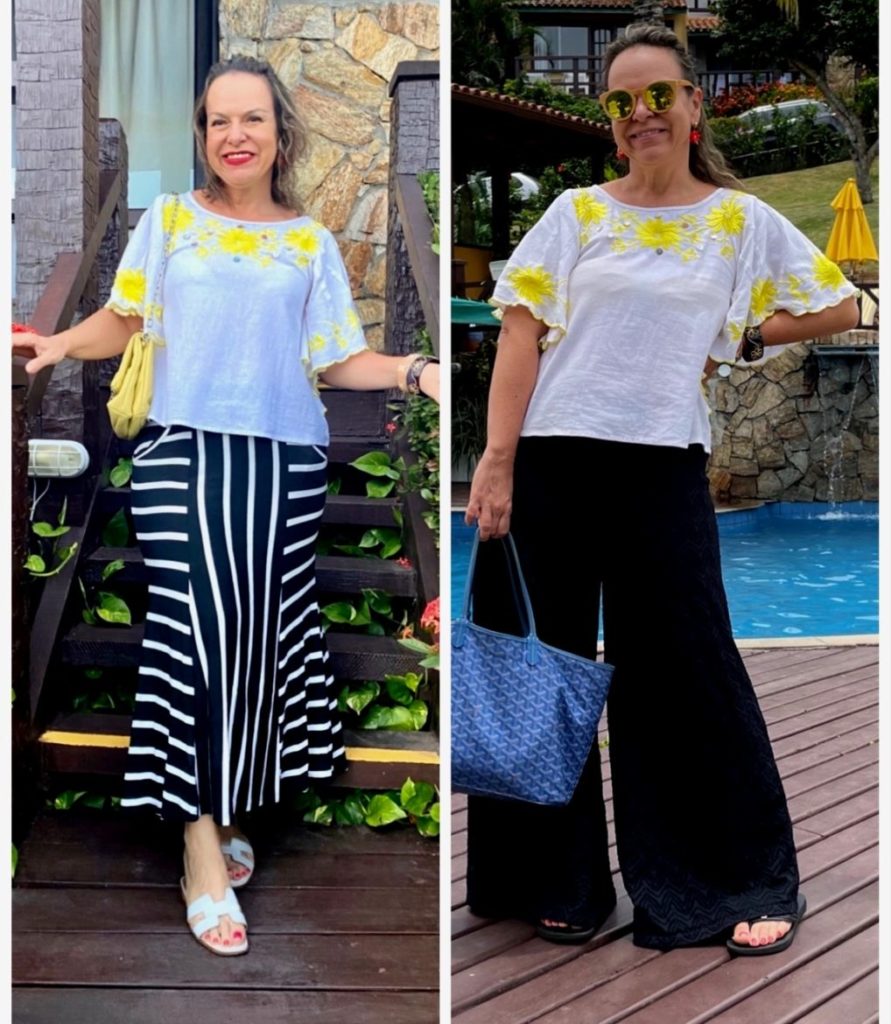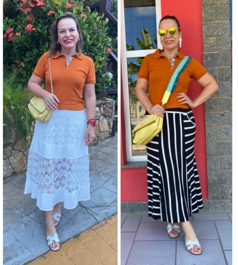 Mesma blusa em versões absolutamente diferentes, sendo valorizada sempre por acessórios interessantes.