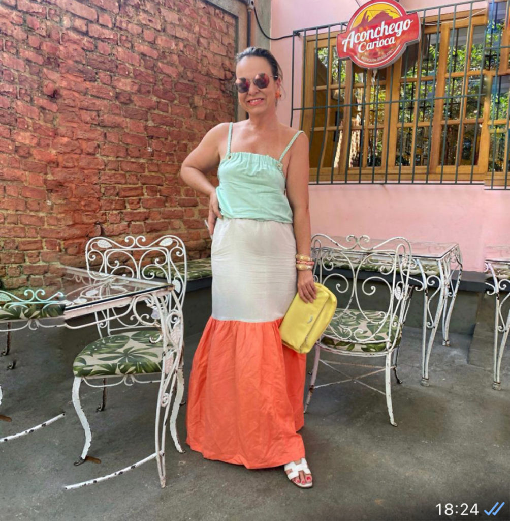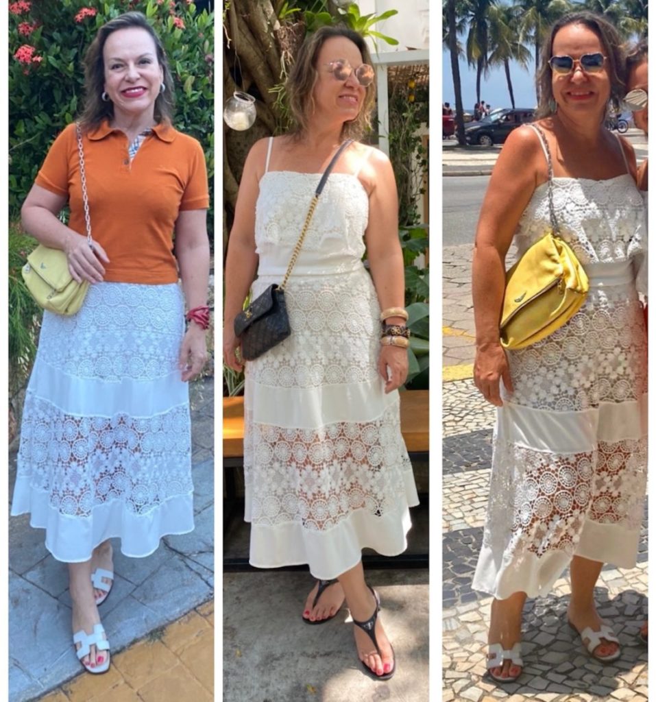 A saia branca, na verdade é um conjunto de saia + top. Usado todo no branco é lindo, com acessórios coloridos mais ainda e pode ainda render mais combinações!