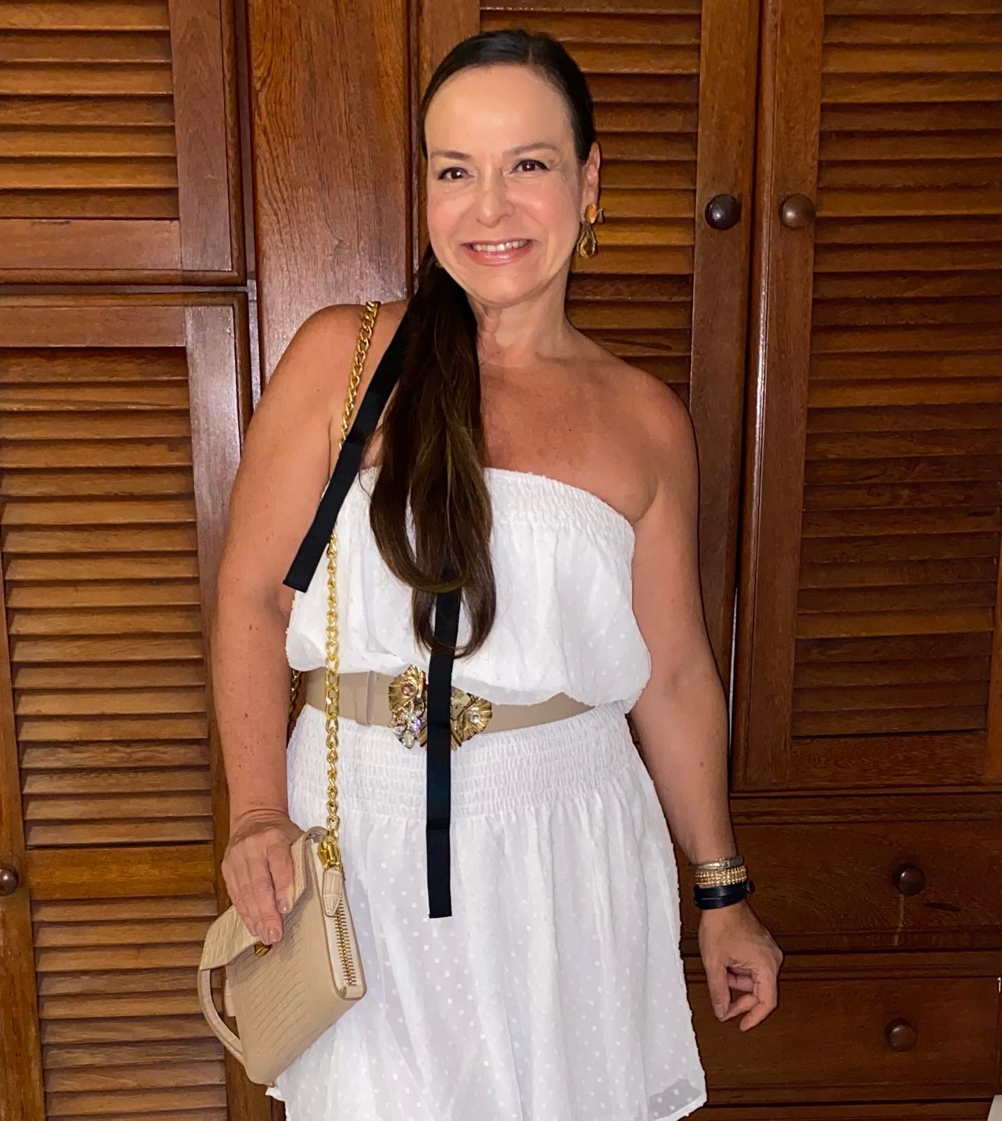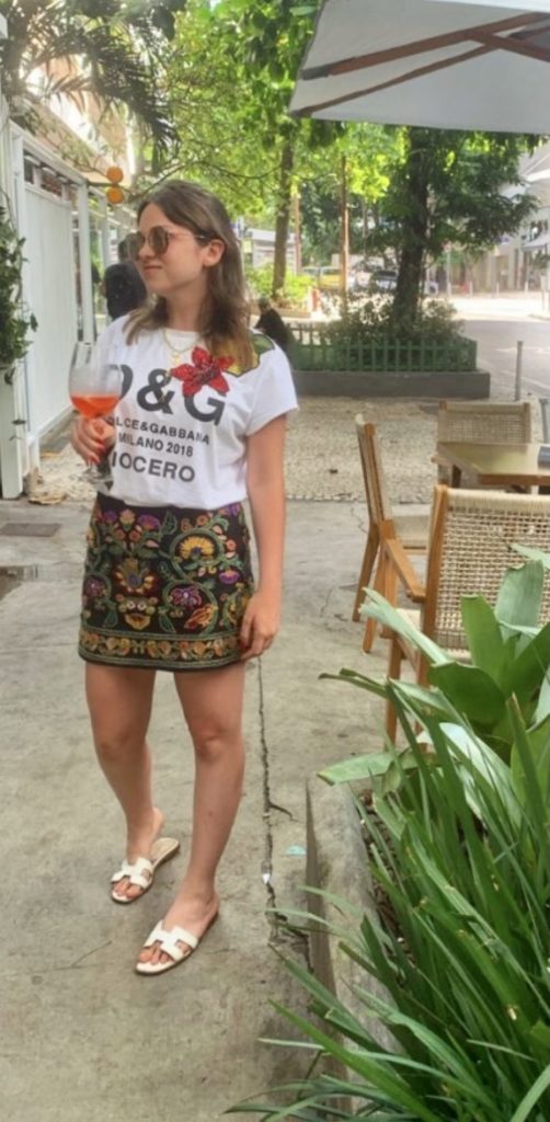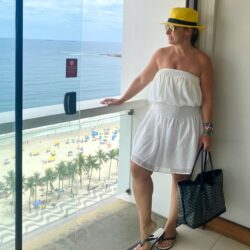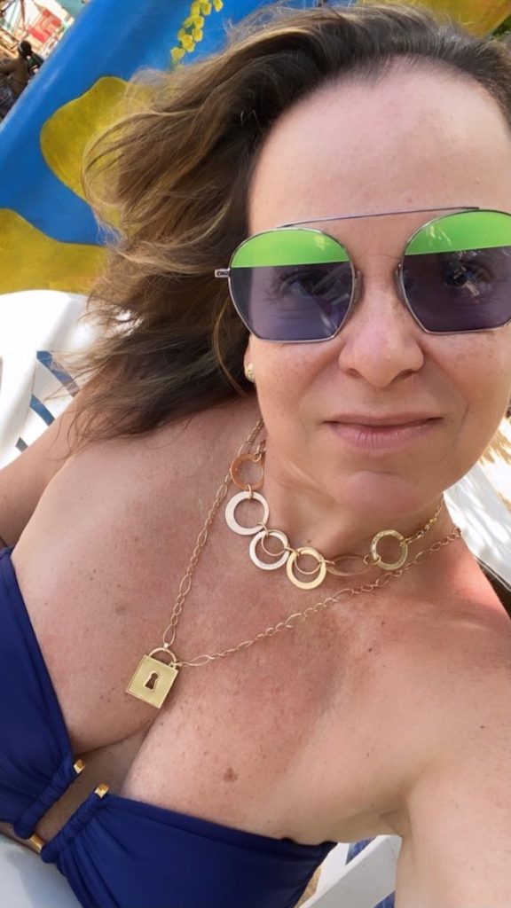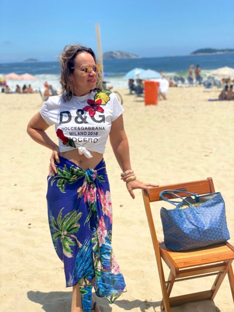 O conjunto de malha de tricô bordado com miçangas, embora seja um look festa na cidade, funciona super bem na praia, se “desconstruído” com acessórios descolados. Em Búzios, sempre de rasteirinha, a mesma em caramelo da HERMÈS, enquanto o tamanco de salto grosso funciona bem no Rio à noite nos restaurantes mais bacanas.