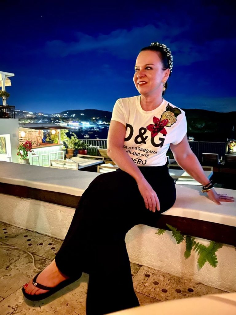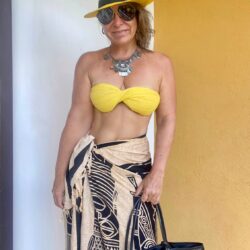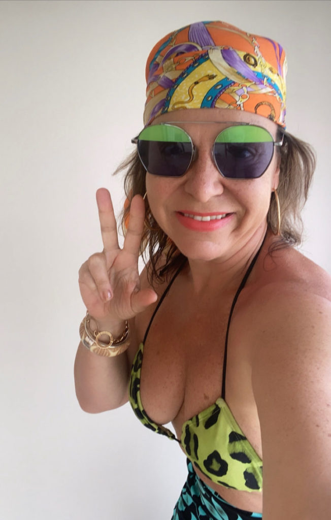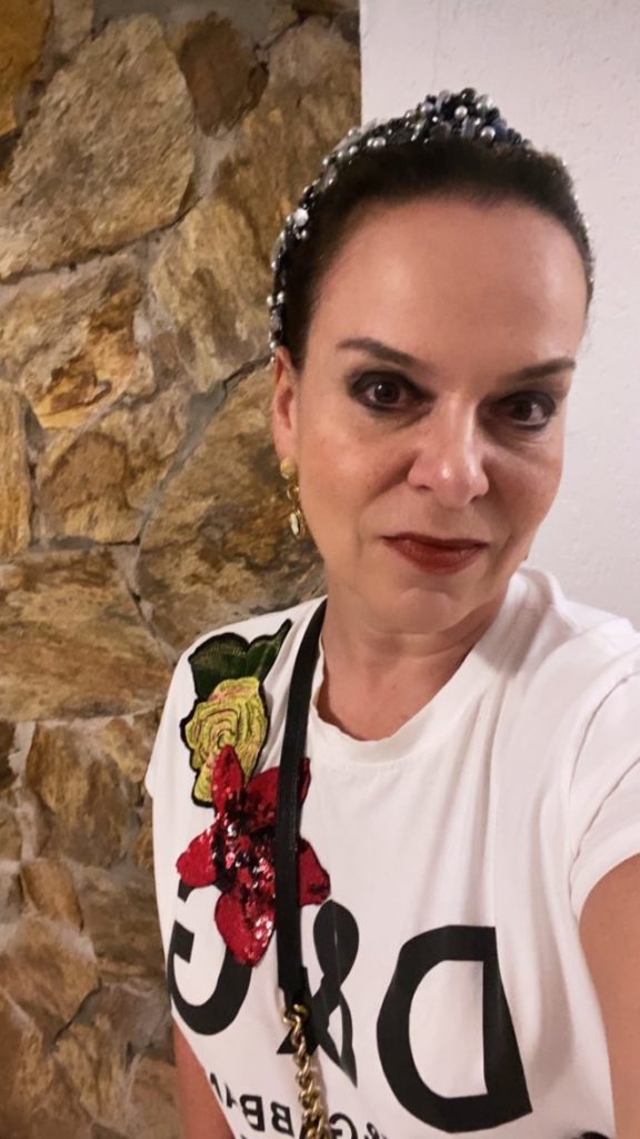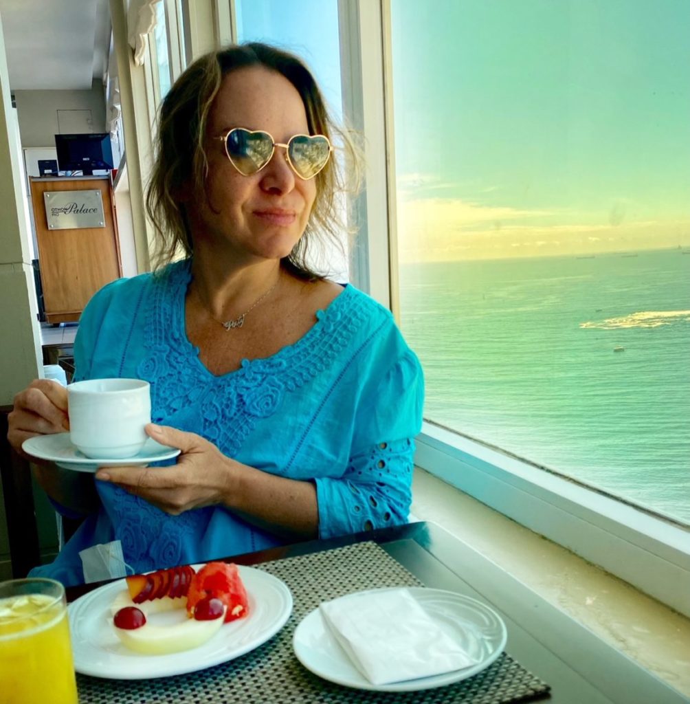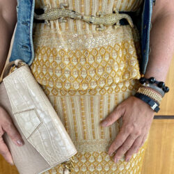 O conjunto de malha de tricô bordado com miçangas, embora seja um look festa na cidade, funciona super bem na praia, se “desconstruído” com acessórios descolados. Em Búzios, sempre de rasteirinha, a mesma em caramelo da HERMÈS, enquanto o tamanco de salto grosso funciona bem no Rio à noite nos restaurantes mais bacanas.