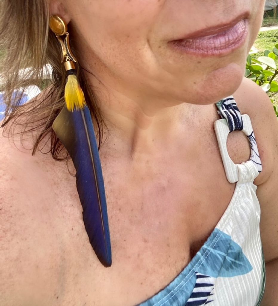 Repare no brinco JOIAS PD com uma pena de arara-azul. Joia pode ter personalidade sim!
