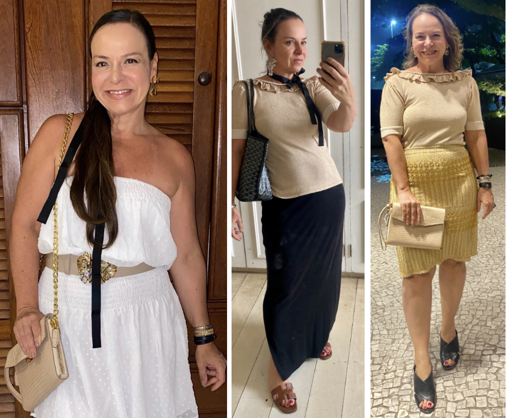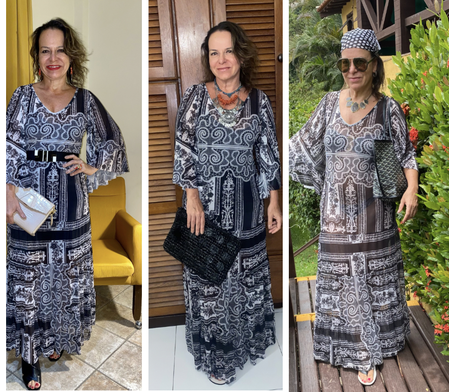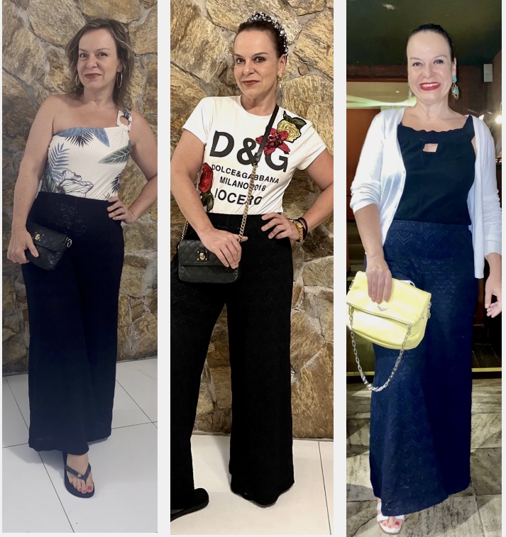 Como são peças únicas, mesmo assim dei um jeito de repetí-los com uma “cara” diferente nos jantares do Rio de Janeiro. Continuo acreditando que acessórios fazem milagres sempre, mais ainda numa mala de viagem.