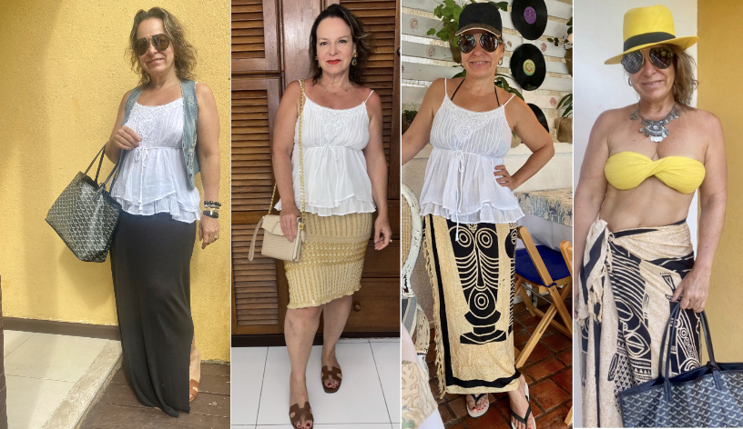 Existe uma base em bege, branco e preto com peças intercambiáveis que fazem o quebra-cabeças funcionar bem por tantos dias. A saia longa preta em malha é um coringão e funciona super bem na mala, pois não ocupa espaço e transita bem em looks dia e noite.