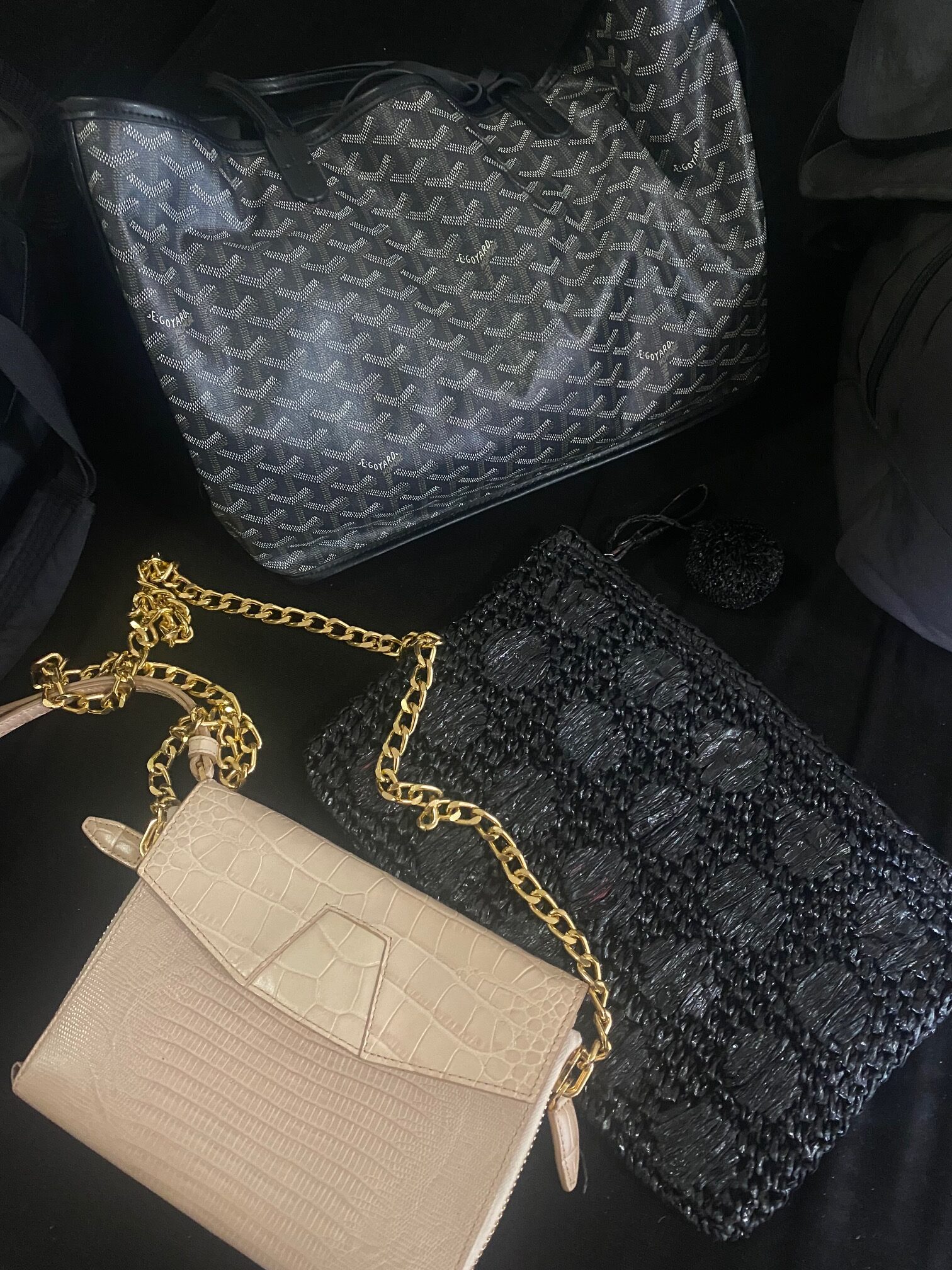 Uma bolsa preta leve e grande tanto para a viagem quanto para a praia, uma clutch de palha preta e uma carteirona nude com alça cruzada de por e tirar . Uma rasteira, um salto grosso, um tênis para caminhada e um chinelo.