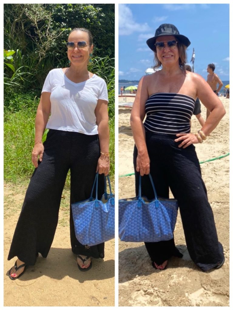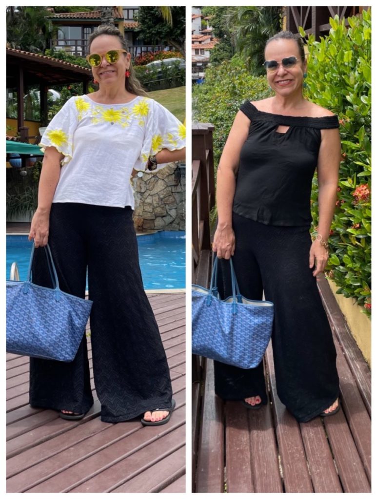 Usei 4 vezes na praia e também à noite, com um shortinho preto de underwear que funcionou super bem. Com isso, essa foi a única peça preta coringa que atravessou pela minha mala. Aliás, não curto muito all black nem na cidade, quanto mais na praia, mas reconheço que funcionou à noite lindamente como uma pantalona chique.