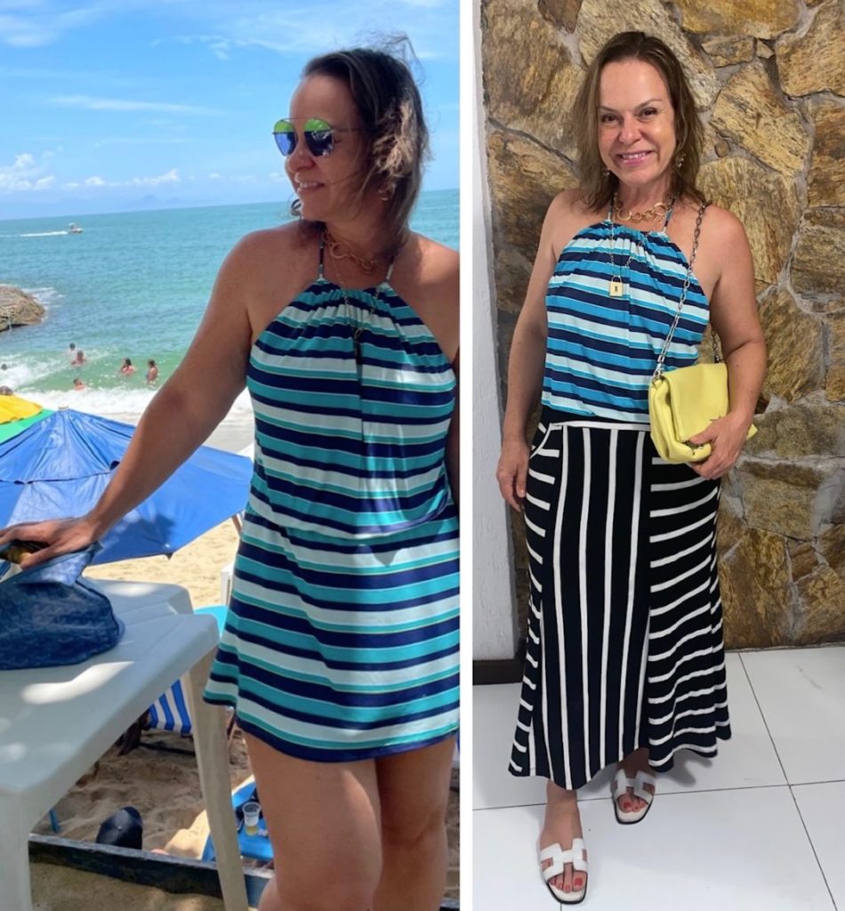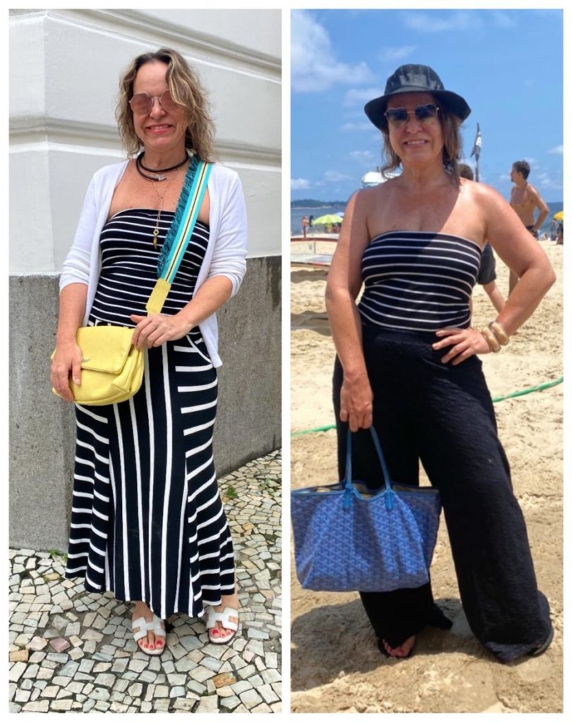 Mesmo top listrado em 2 versões e a saída virou look noite também.