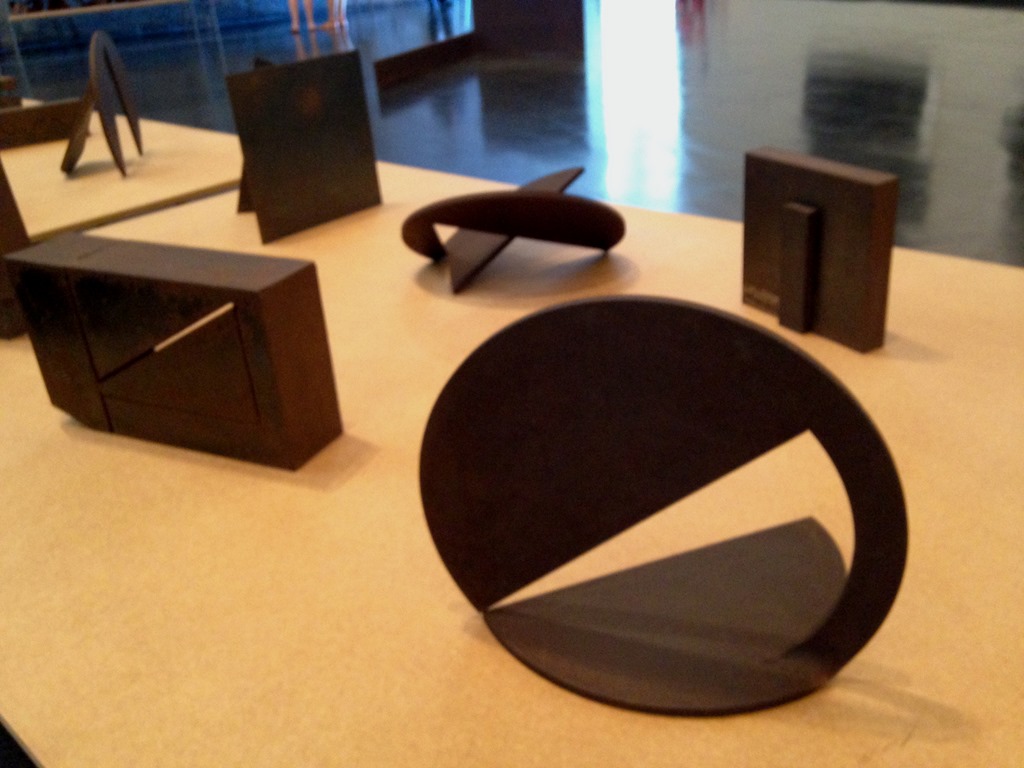 … e mais esculturas de grande e médio porte , …  e mais 140 esculturas de pequeno porte, nenhuma delas igual à outra. Isso mostra as inúmeras possibilidades de se obter formas tridimensionais a partir de um quadrado, retângulo ou círculo sem o uso da solda. Essa foi a contribuição de Amilcar de Castro ao movimento neoconcretista dos anos 50, na era pós Vargas e início do Plano de Metas de JK. A arte nacional precisava acompanhar a cena brasileira, com as obras arquitetônicas em linhas retas de Niemeyer abrindo novos caminhos.