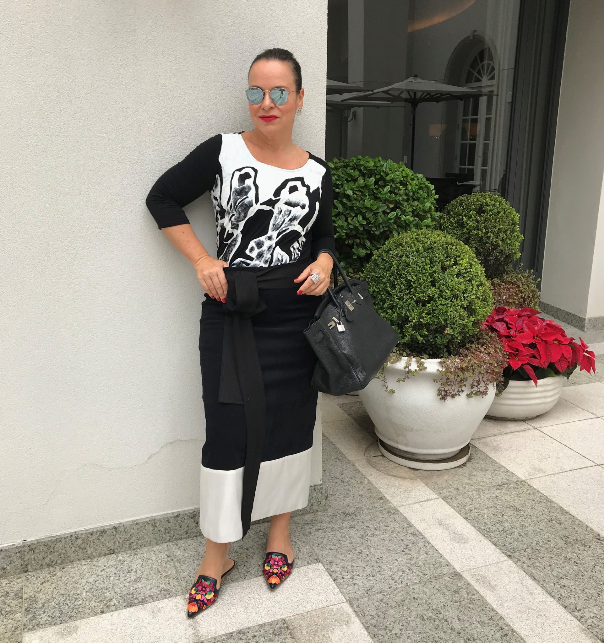 A base do look continuava em P&B, mas dessa vez com o toque de cor e estilo da mule LUIZA BARCELOS.