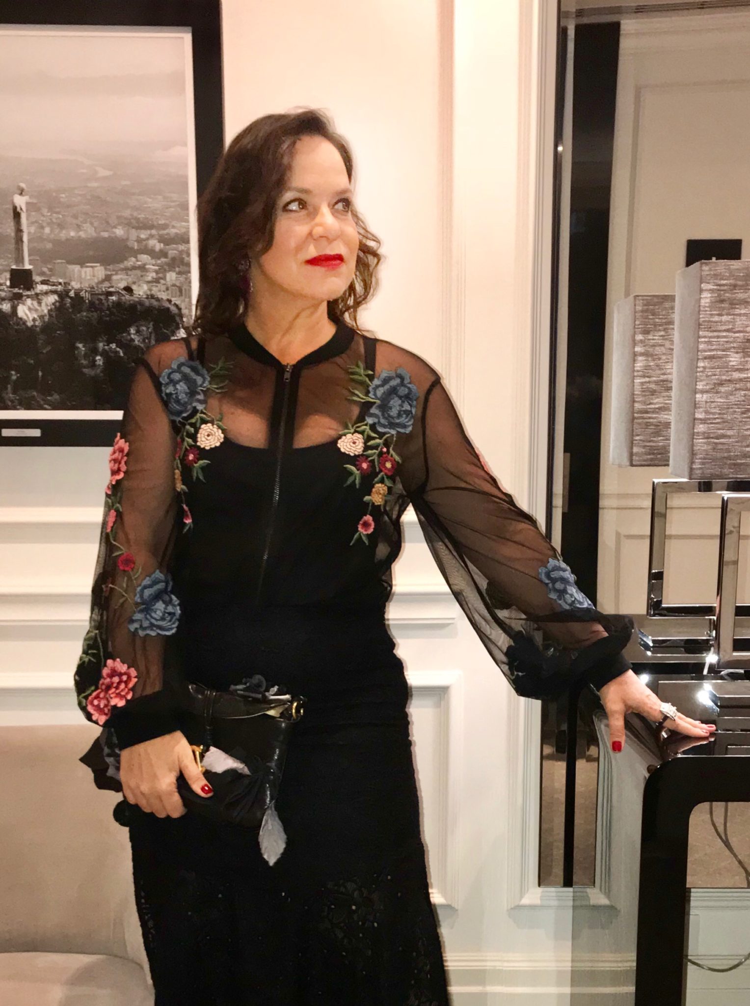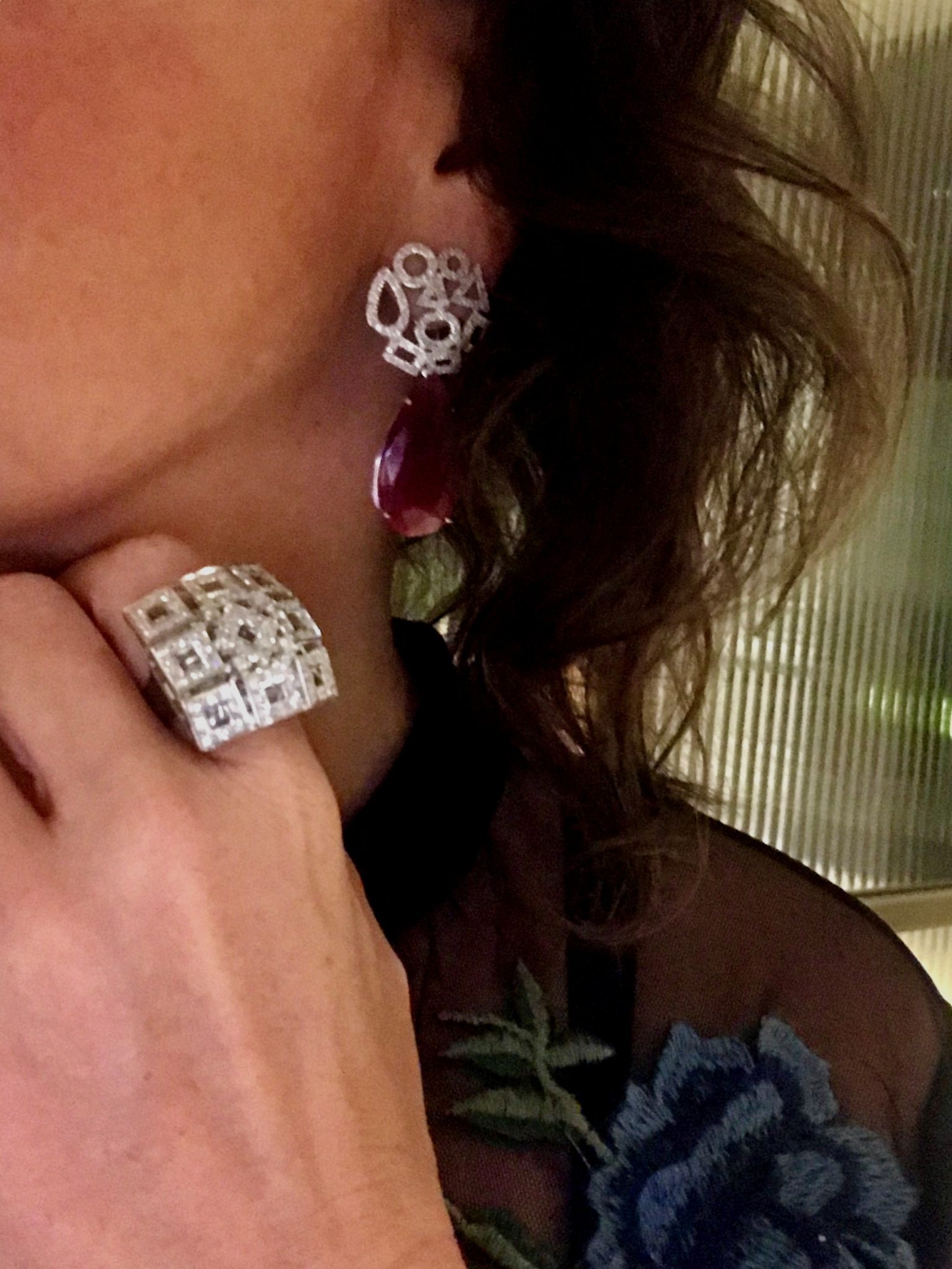 A bolsa de flores conversa com as flores da blusa. O brinco em rubis conversa com o batom e o esmalte.