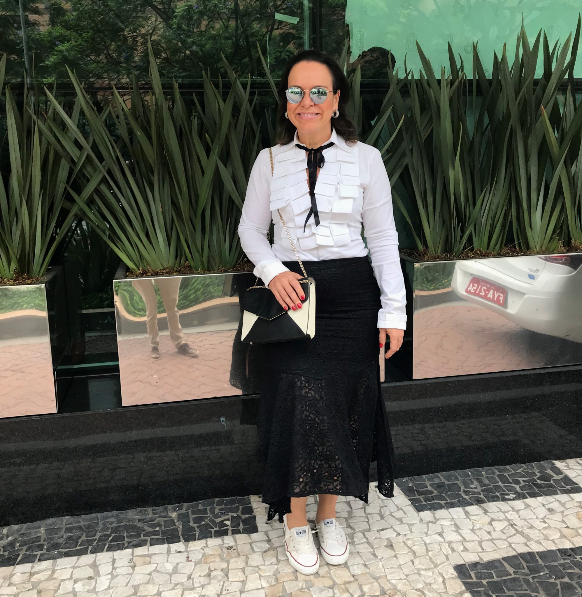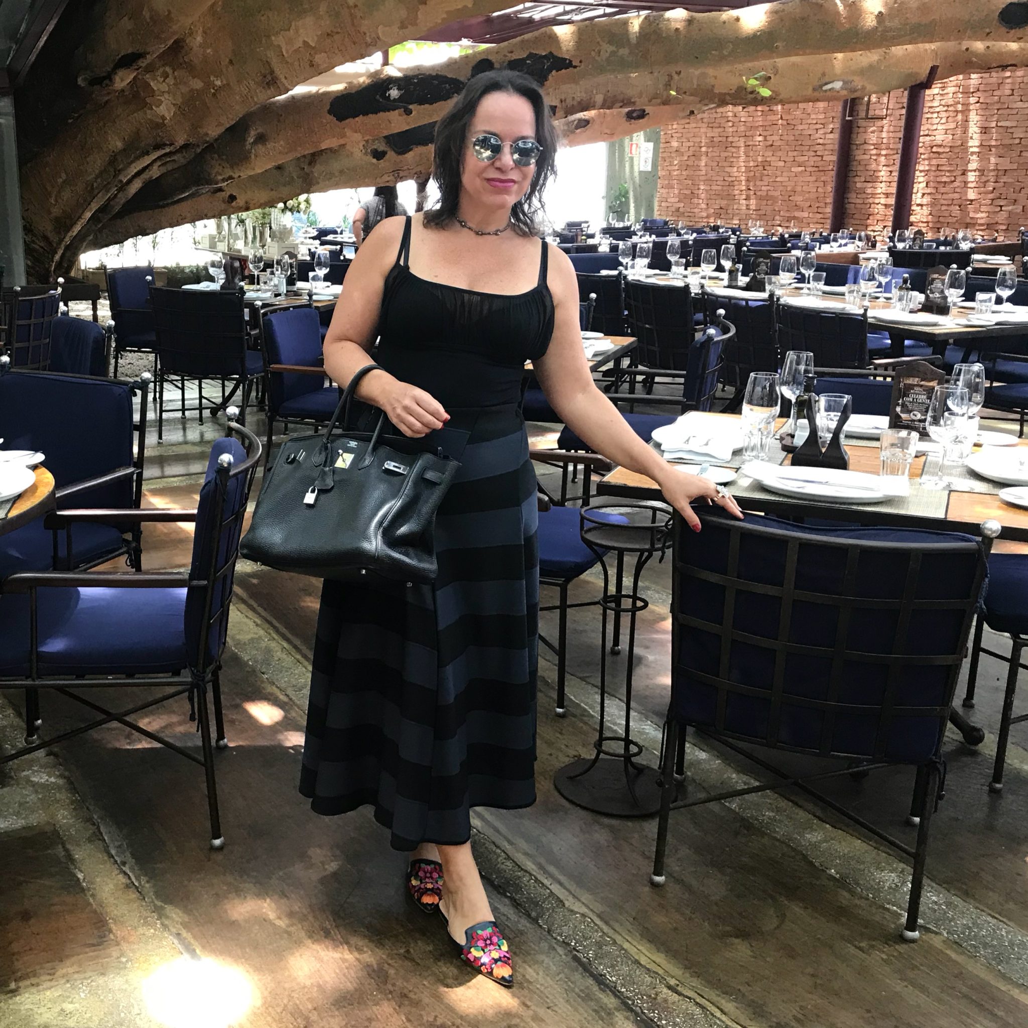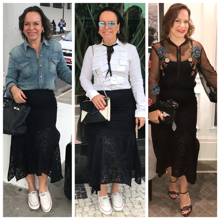 A mesma saia saiu para jantar, acreditam? Viu como dá para multiplicar os looks na mala enxuta?