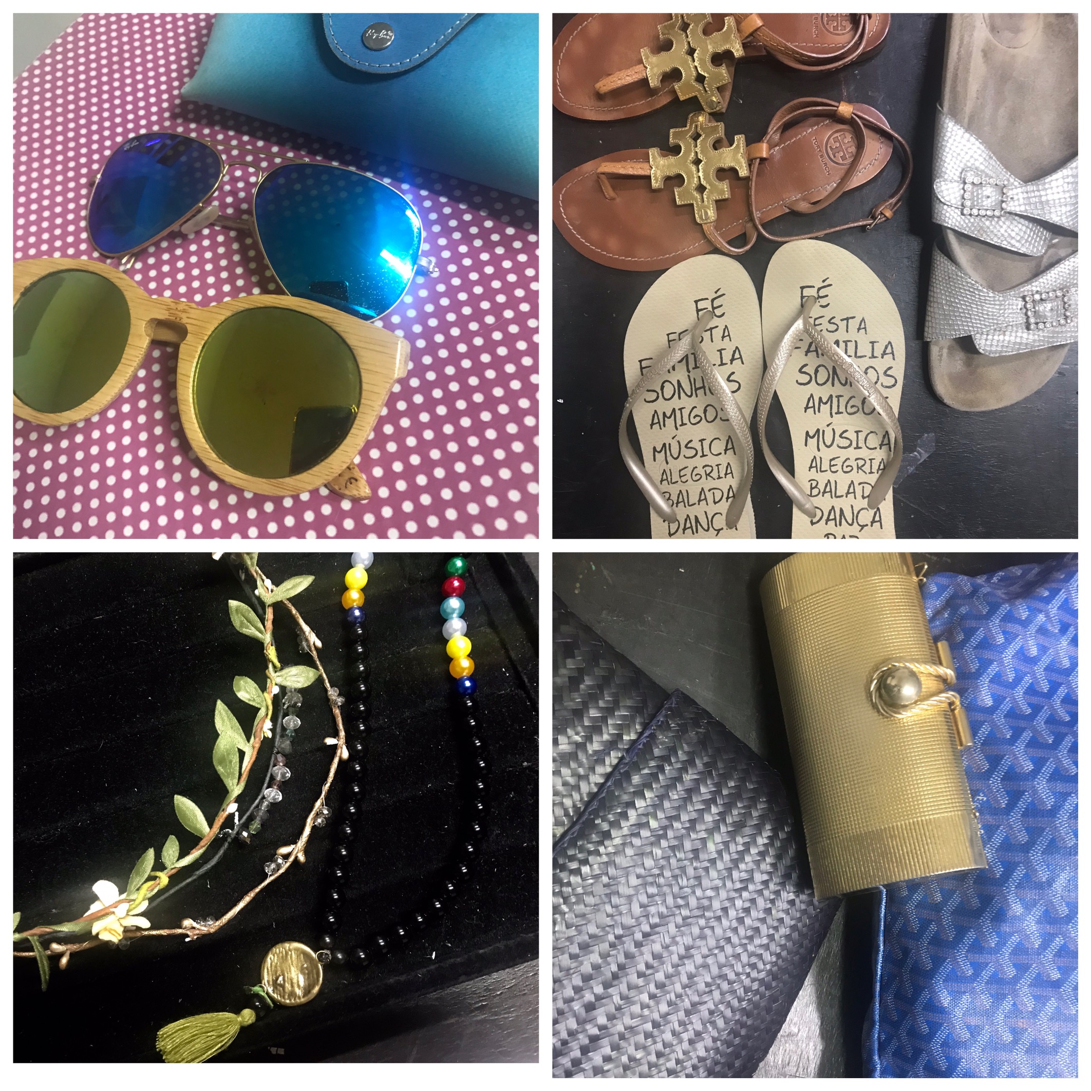 Clima de praia pede cara de praia . Eu levei 2 óculos espelhados ( adoro em praia!! ) , apenas 2 rasteiras e um par de Havaianas, 1 bolsa grande ( a mesma para o avião e para a praia ) e 2 bolsas pequenas ( uma dourada de cruzar e uma carteira de palha ). Fiz graça com tiaras de cabelo e com um marcador de livros que ganhei, mas que amei usar como colar!