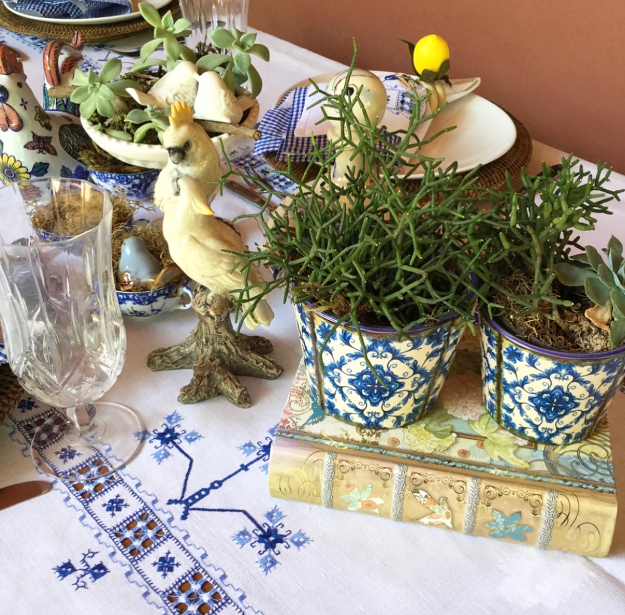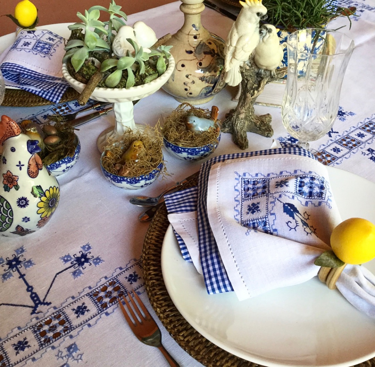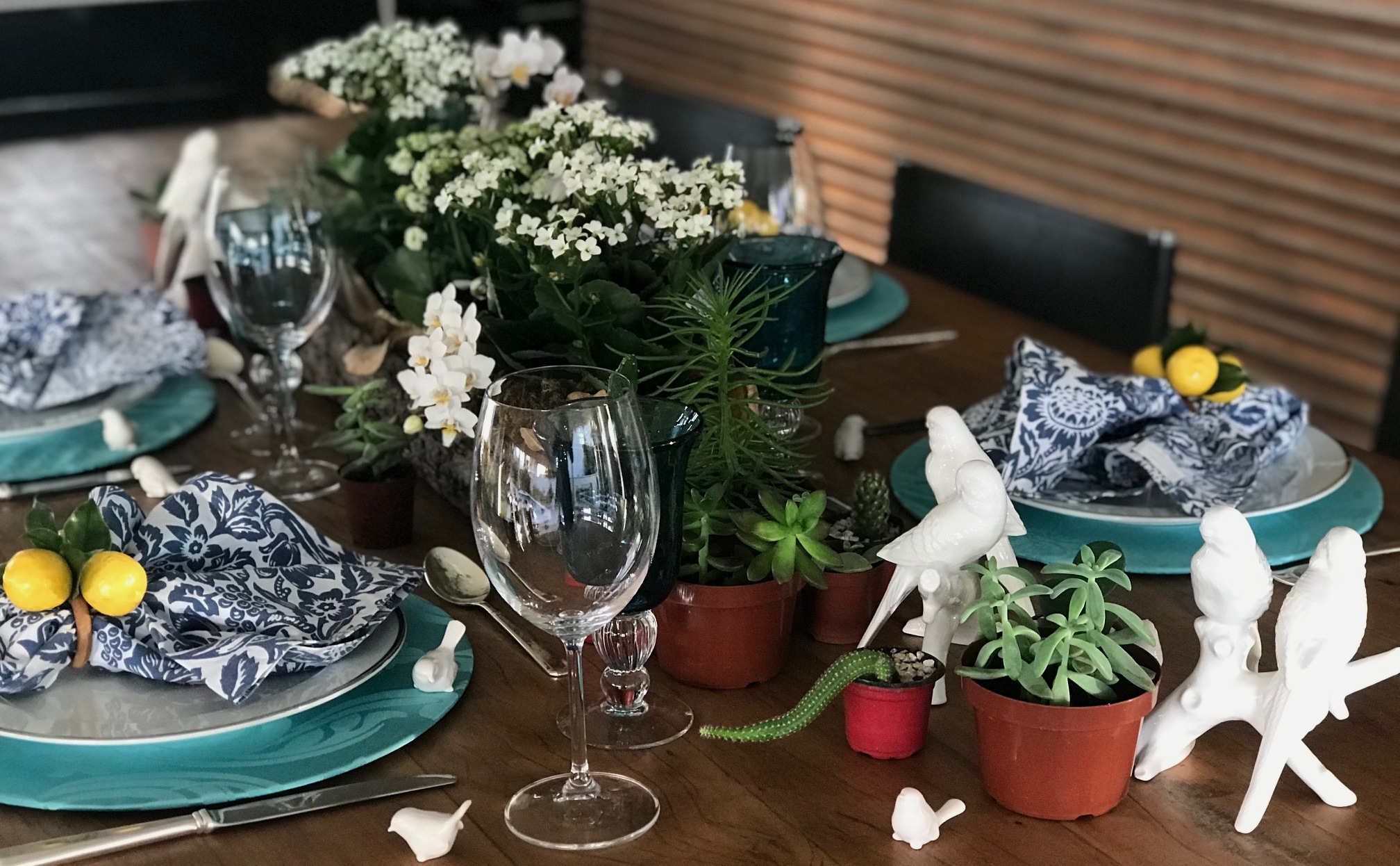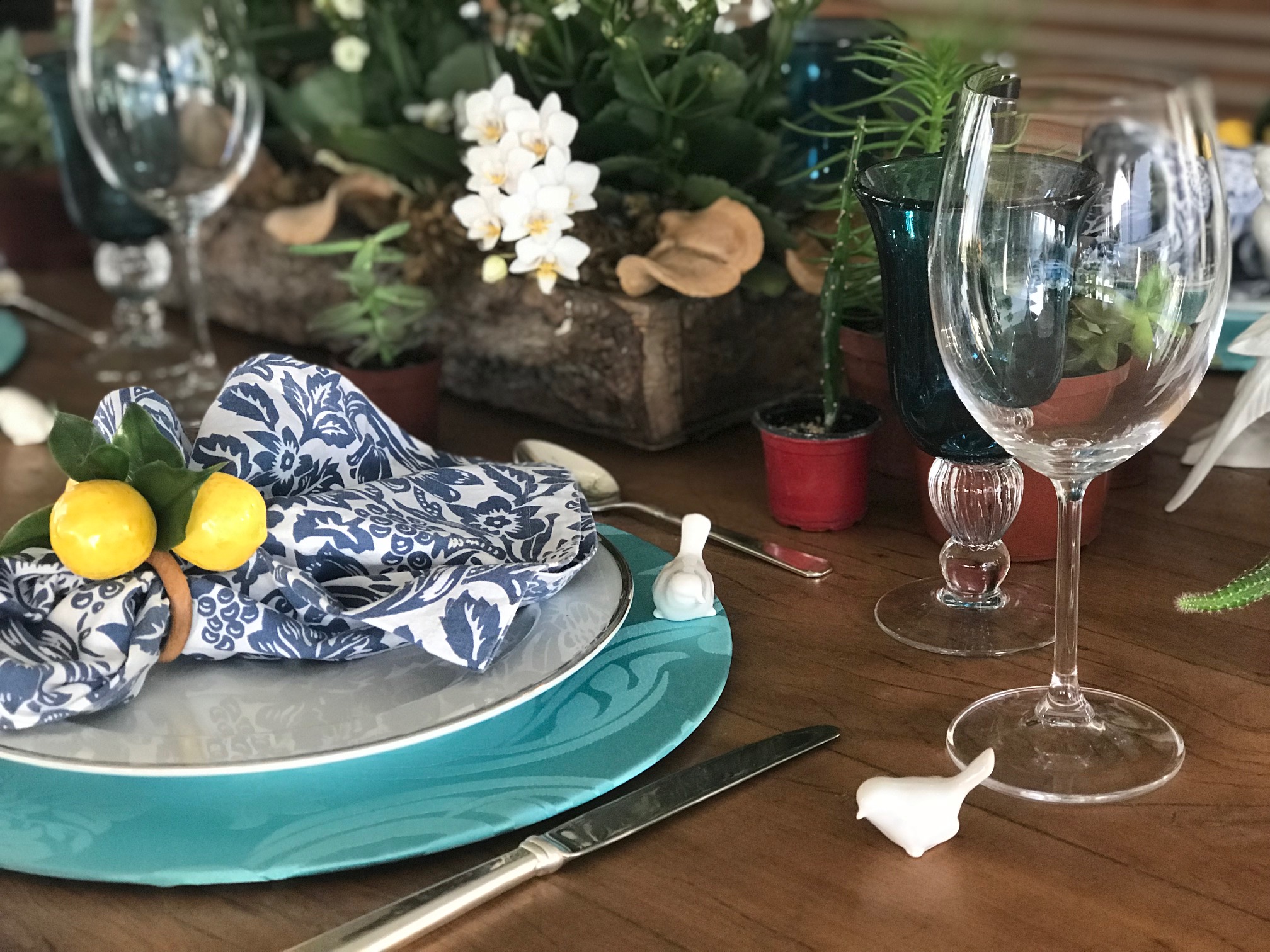Pronto: eu tinha tudo! Guardanapos em azul e branco, as suculentas da FORMATURA DA RAFA , os porta-guardanapos de limão-siciliano e até mesmo os pássaros!