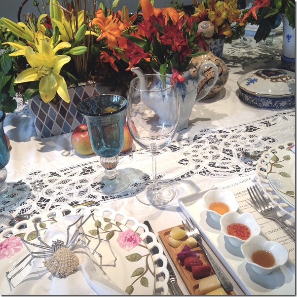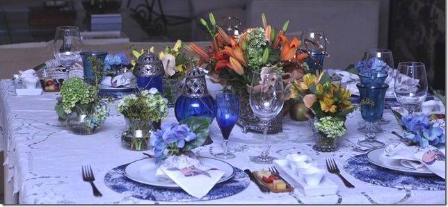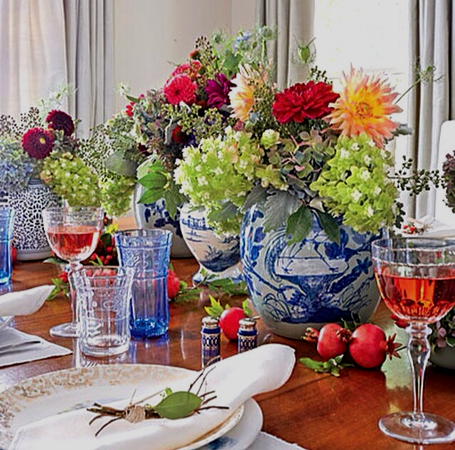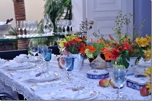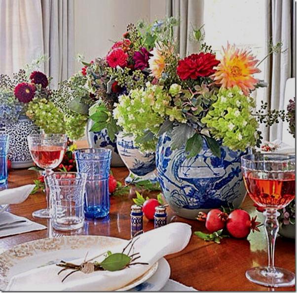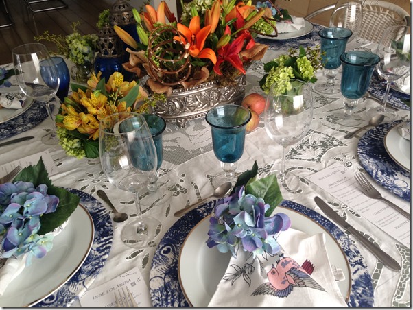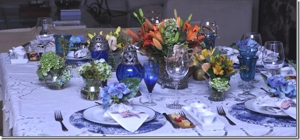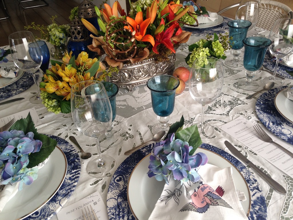 A minha inspiração para montar a mesa tema do Jantar Insetomania: Flores coloridas em potes azuis e brancos, taças azuis,frutas na mesa e os insetos