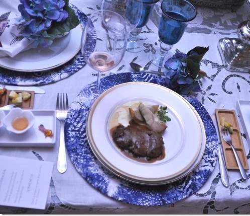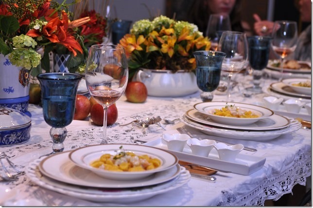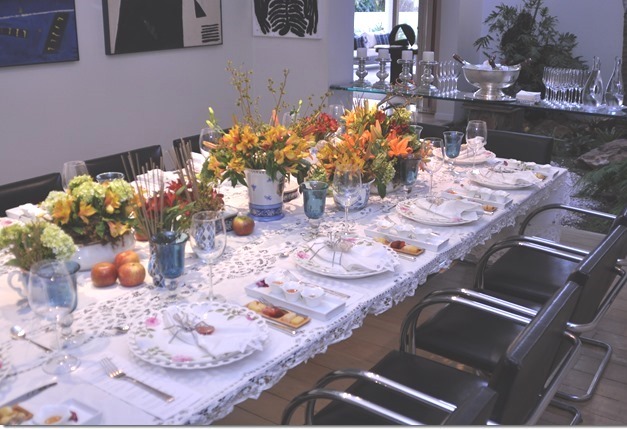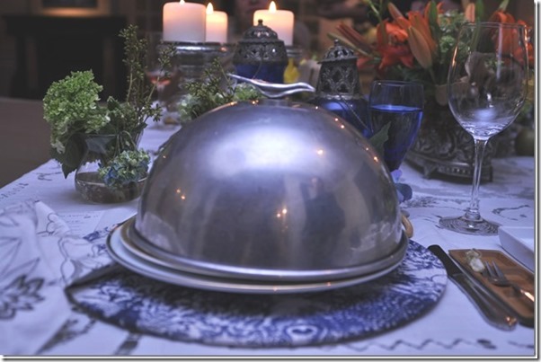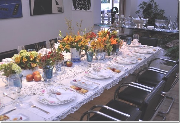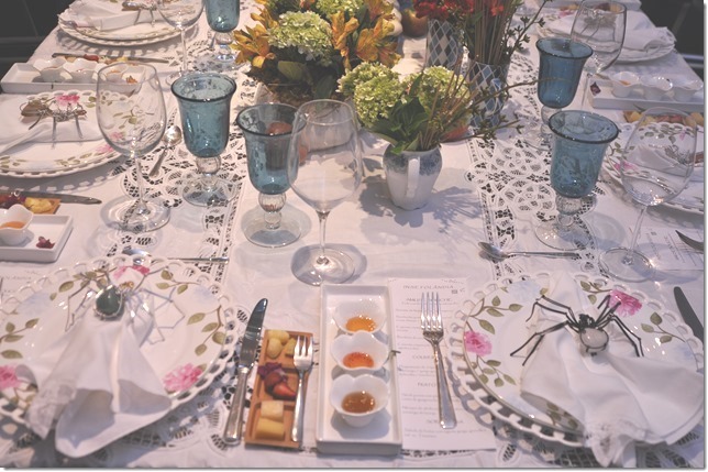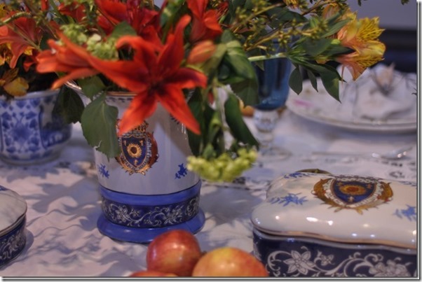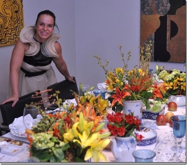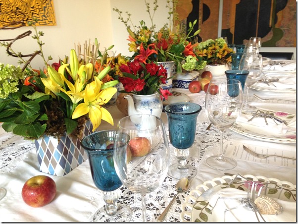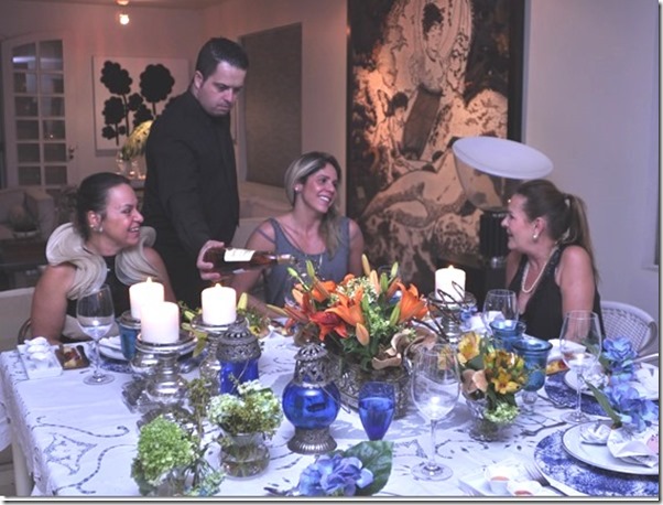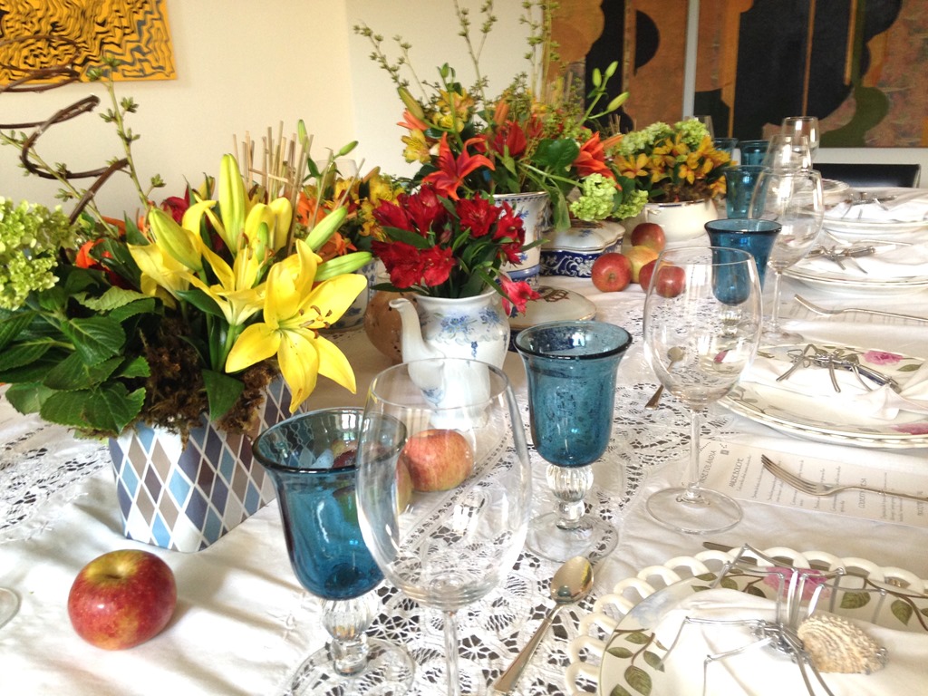 A minha inspiração para montar a mesa tema do Jantar Insetomania: Flores coloridas em potes azuis e brancos, taças azuis,frutas na mesa e os insetos