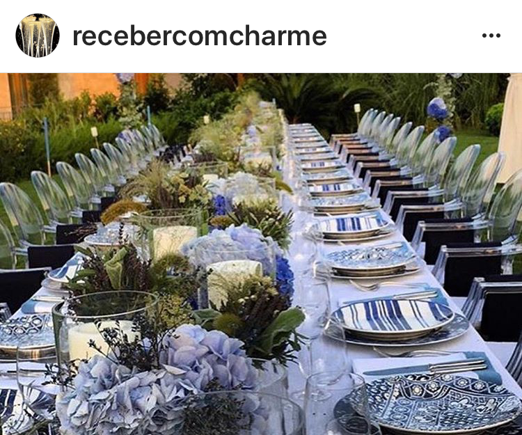 Essa mesa linda em tons de azul do ig que amo seguir @RECEBERCOMCHARME foi a minha inspiração. Flores em vários tons de azul, padronagens diferentes nos pratos, taças em cristal branco.