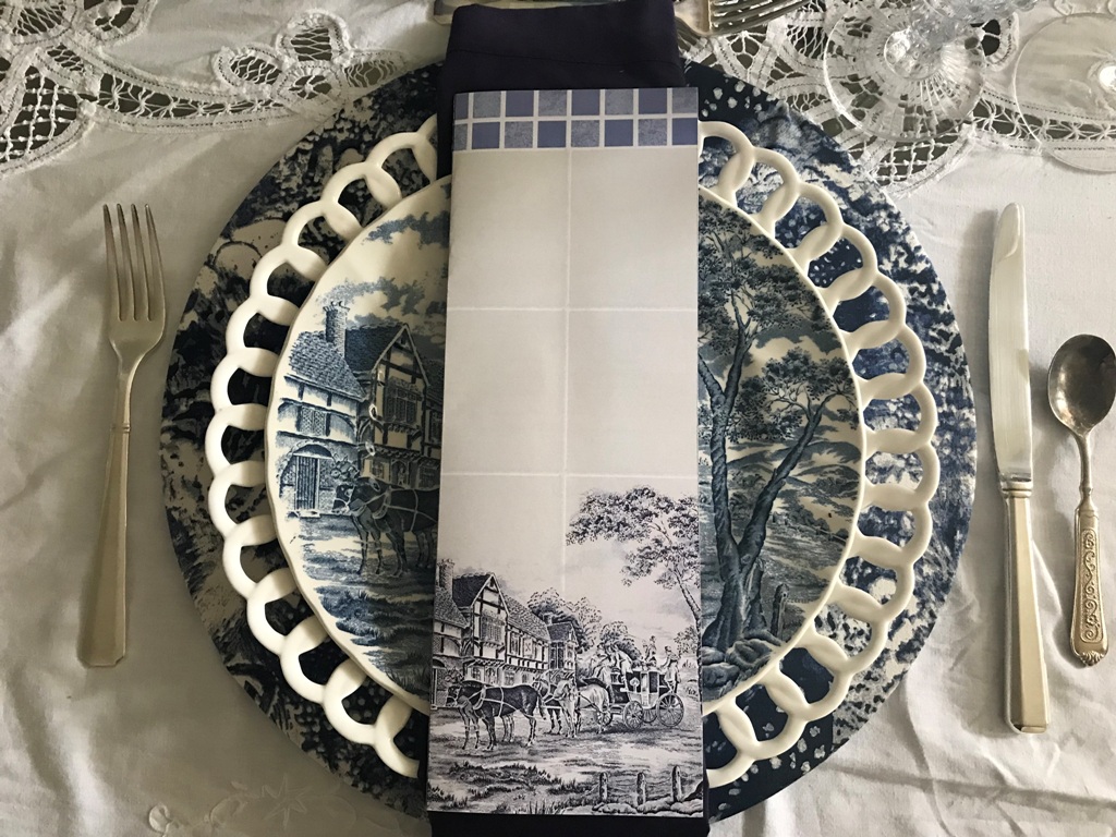 Montei a minha composição com pratos azuis em estampa TOILE DE JOUY , intercalando-os com pratos brancos. Alternei sousplats brancos e azuis; guardanapos azuis e estampados. A graça foi o cardápio impresso na mesma padronagem dos pratos. Faço na IN DESIGN . Clique no azul.
