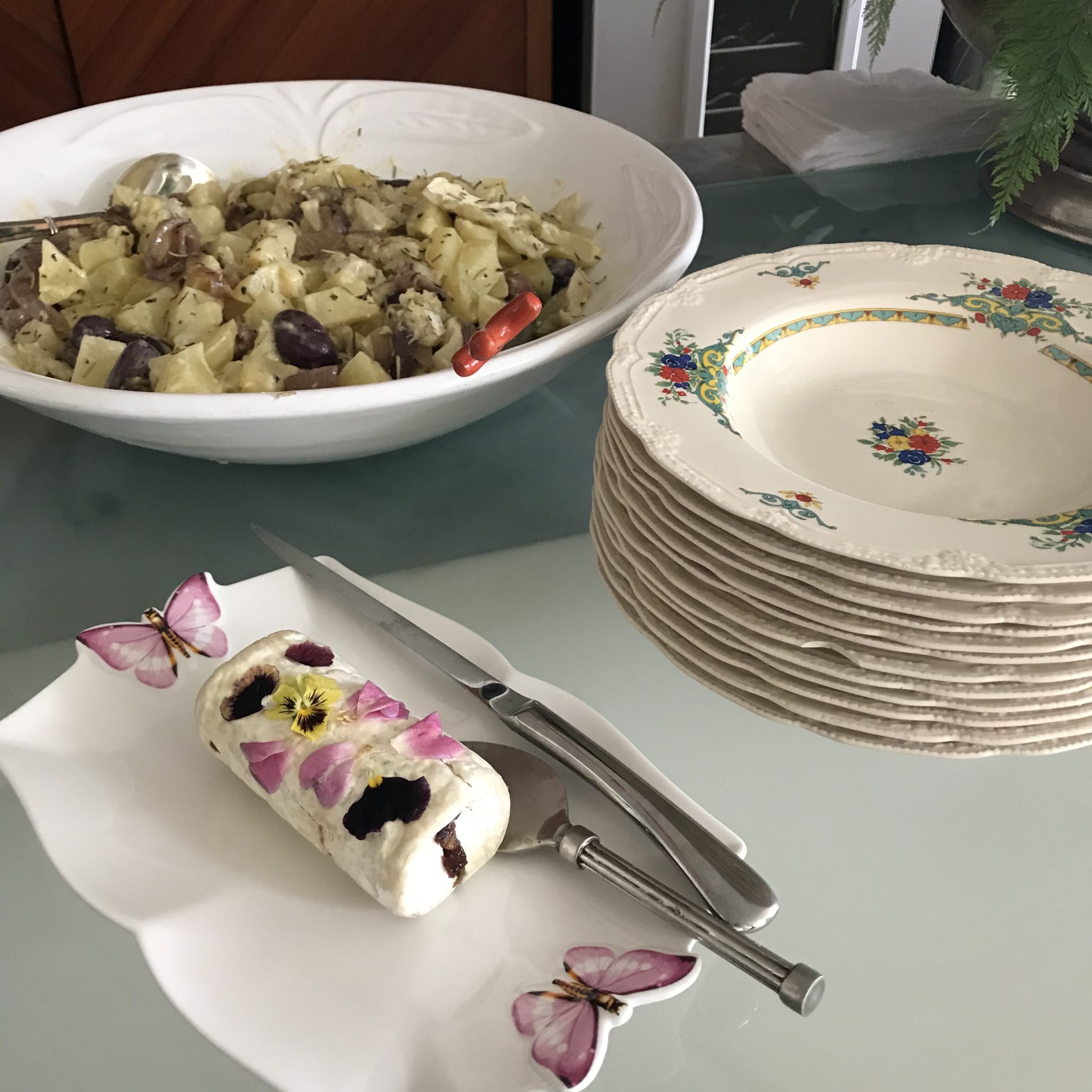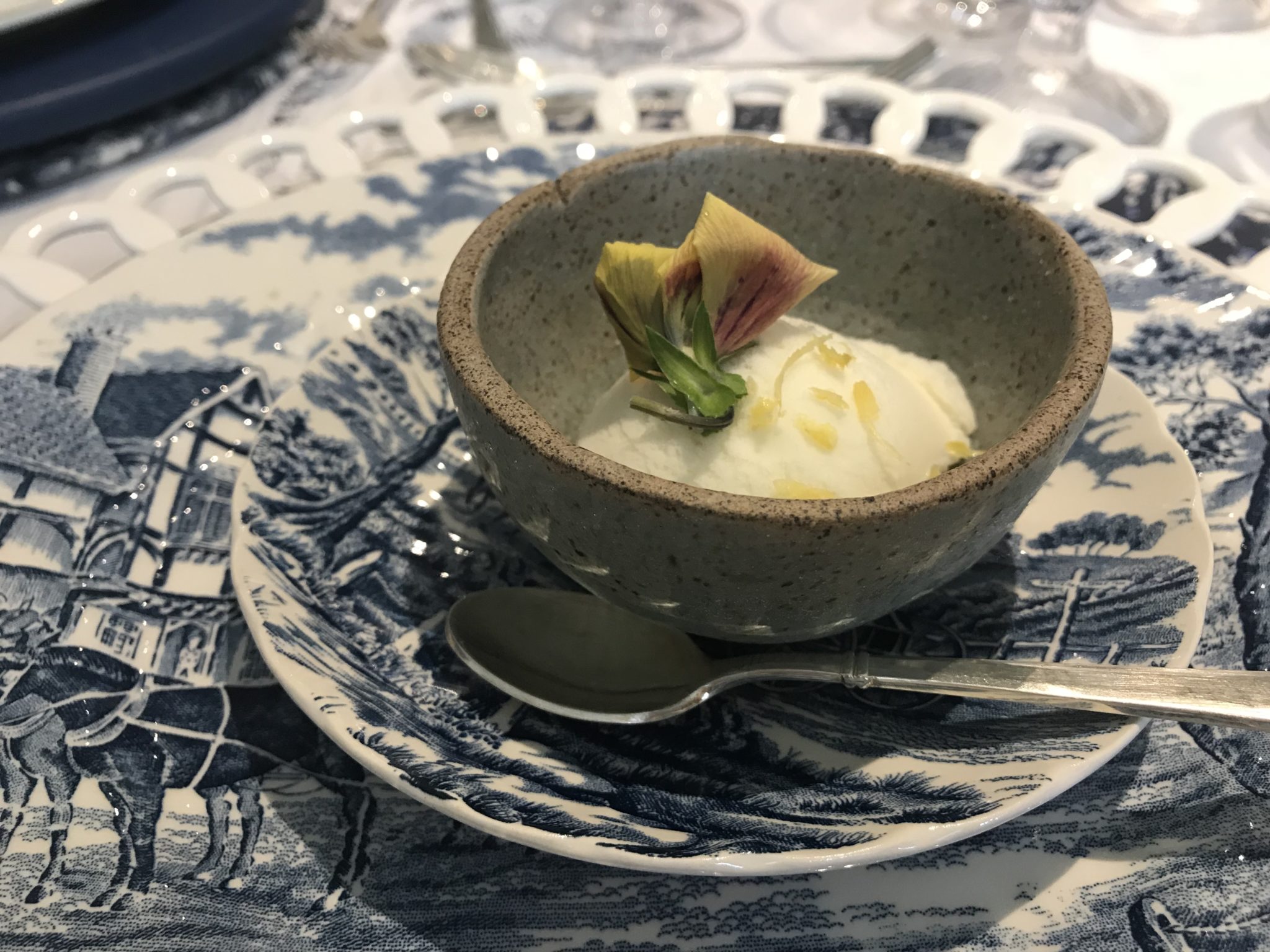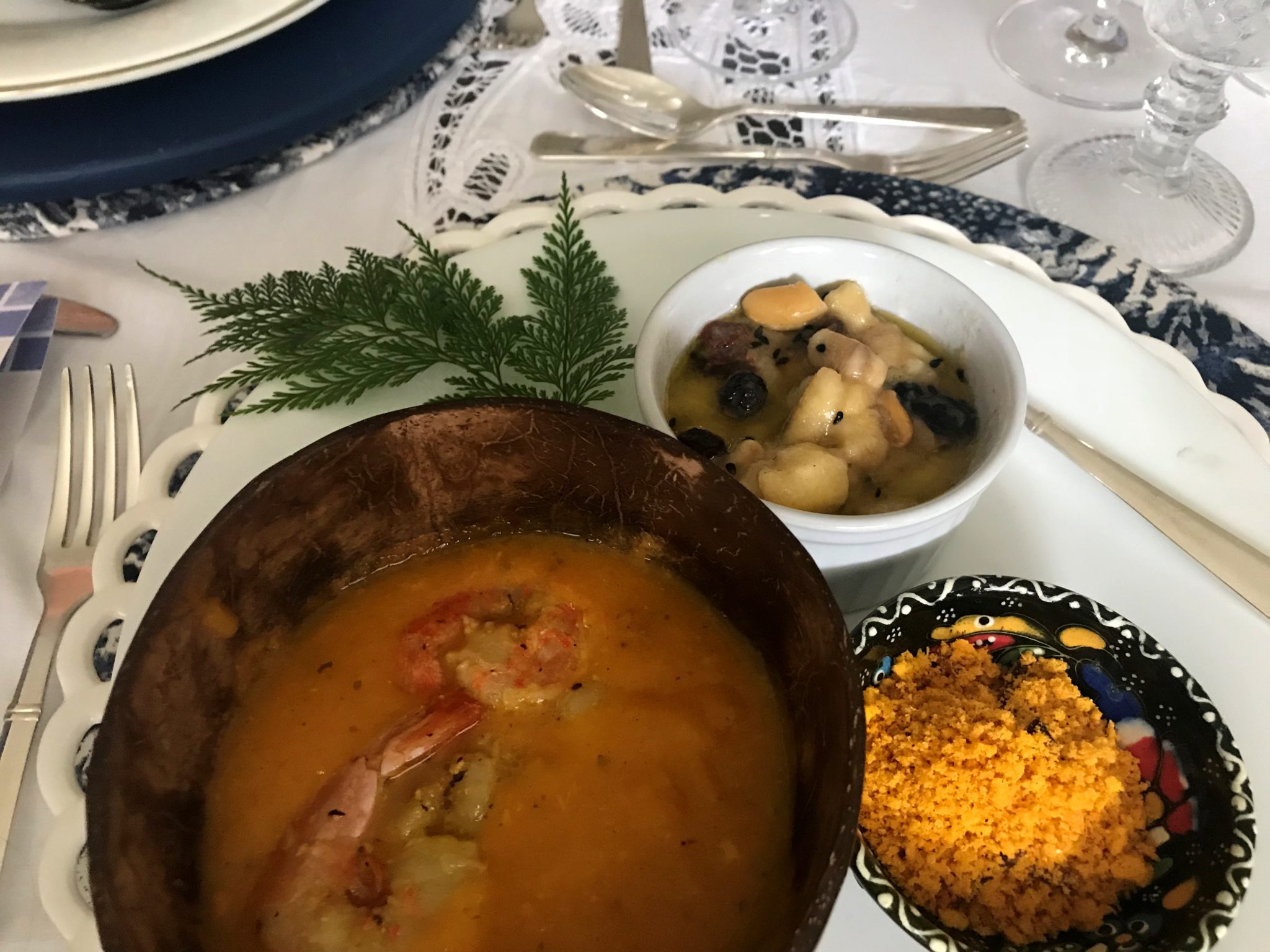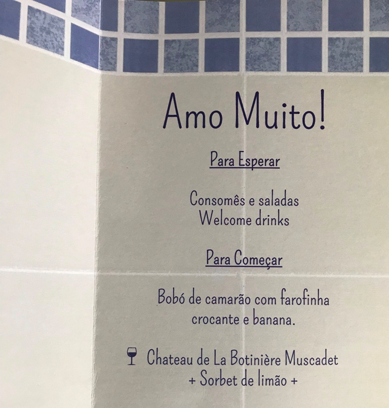 Servi o almoço todo harmonizado, coisa que amo fazer! A graça foi a apresentação da entrada, com as receitas todas aqui no azul. O BOBÓ DE CAMARÃO servi dentro do coco, a BANANA DA MORENA LEITE no ramequin e uma farofinha temperada no potinho. Além de ter ficado linda a apresentação, os sabores se complementam. Vinho branco para acompanhar. Na sequência, um SORBET para trocar o paladar para o próximo prato e próximo vinho.