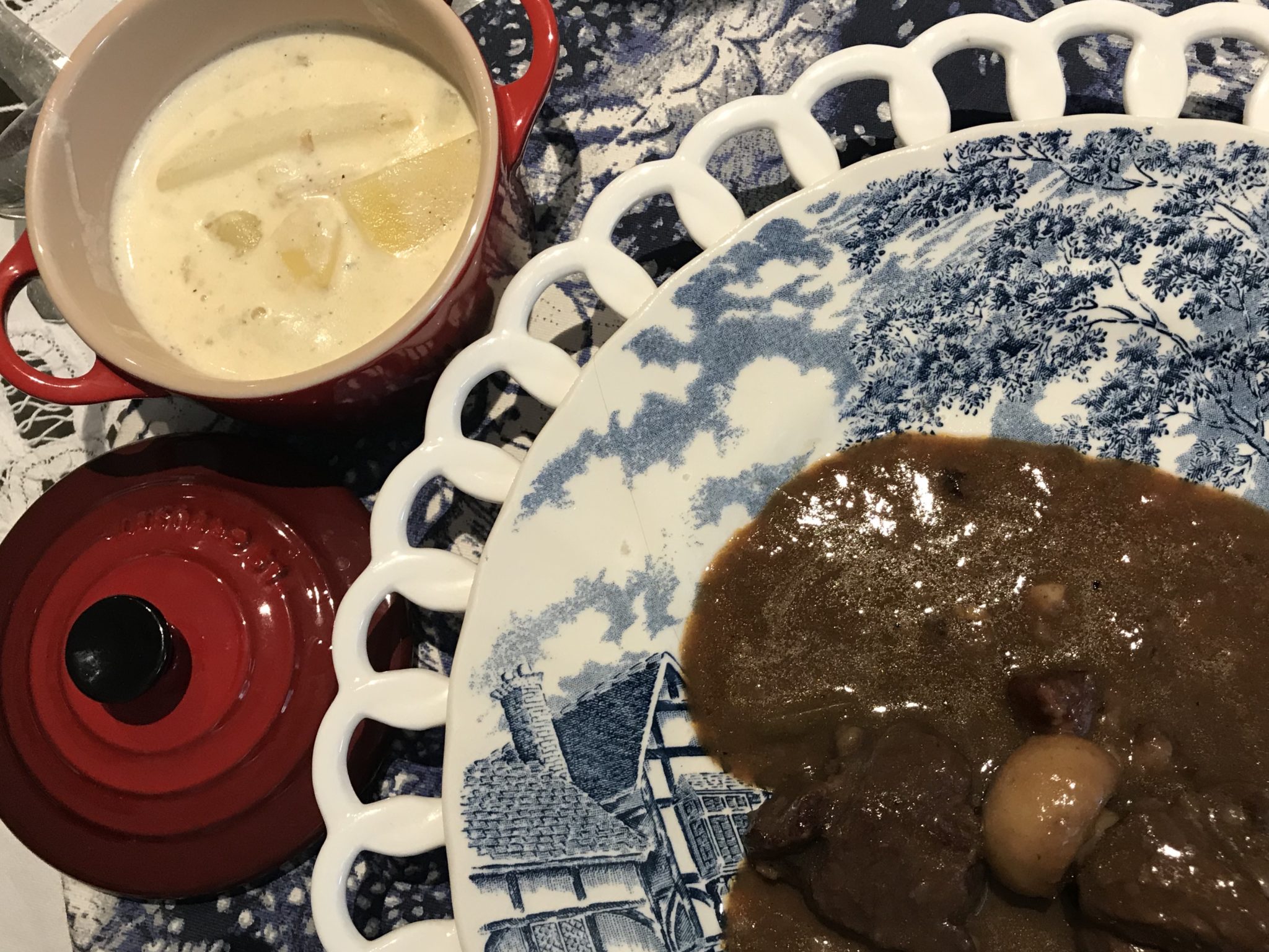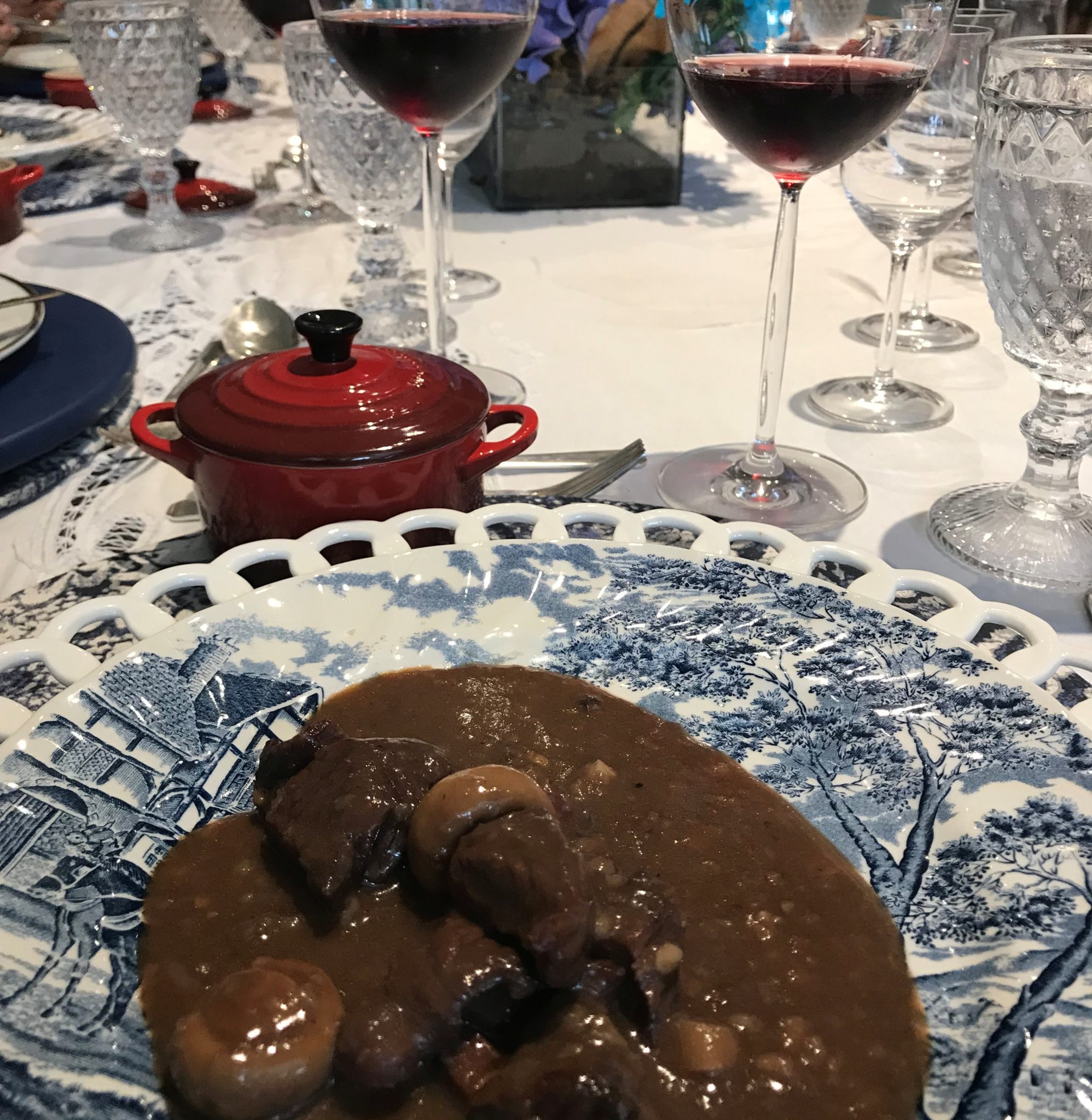 O BOEUF BOURGUIGNON foi servido com as batatas cremosas na panelinha individual. Caprichos que não custam nada e fazem a diferença. Vinho francês da Bourgogne para HARMONIZAR .