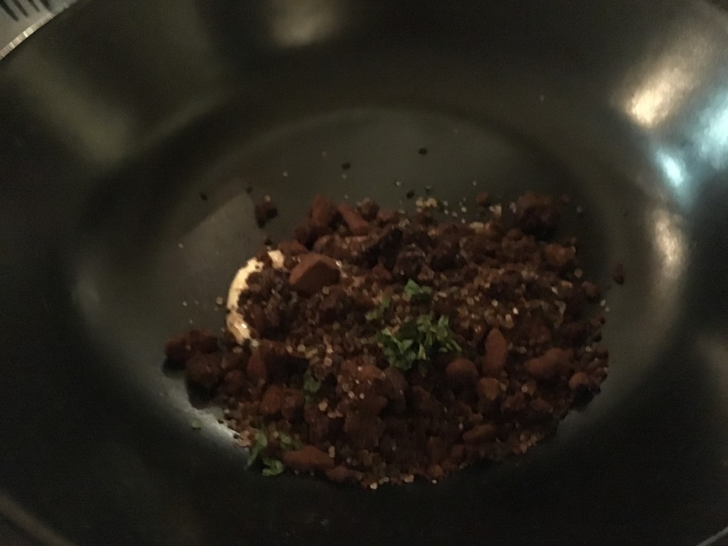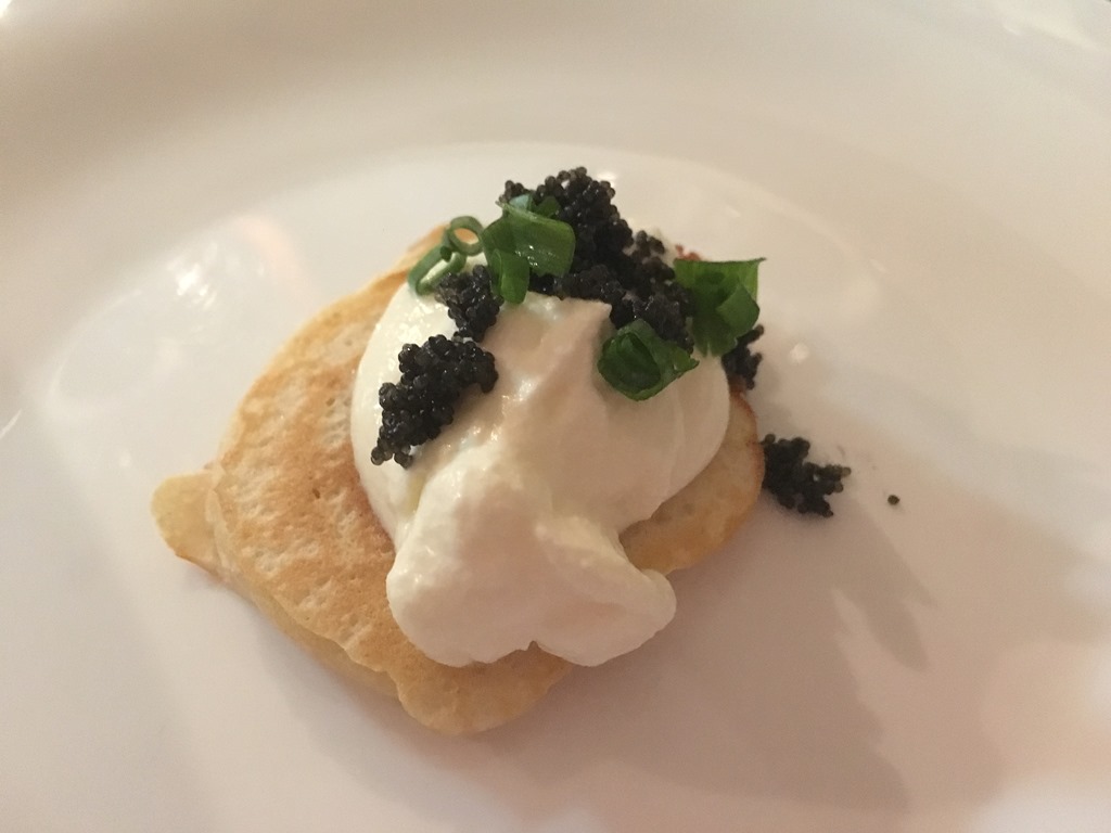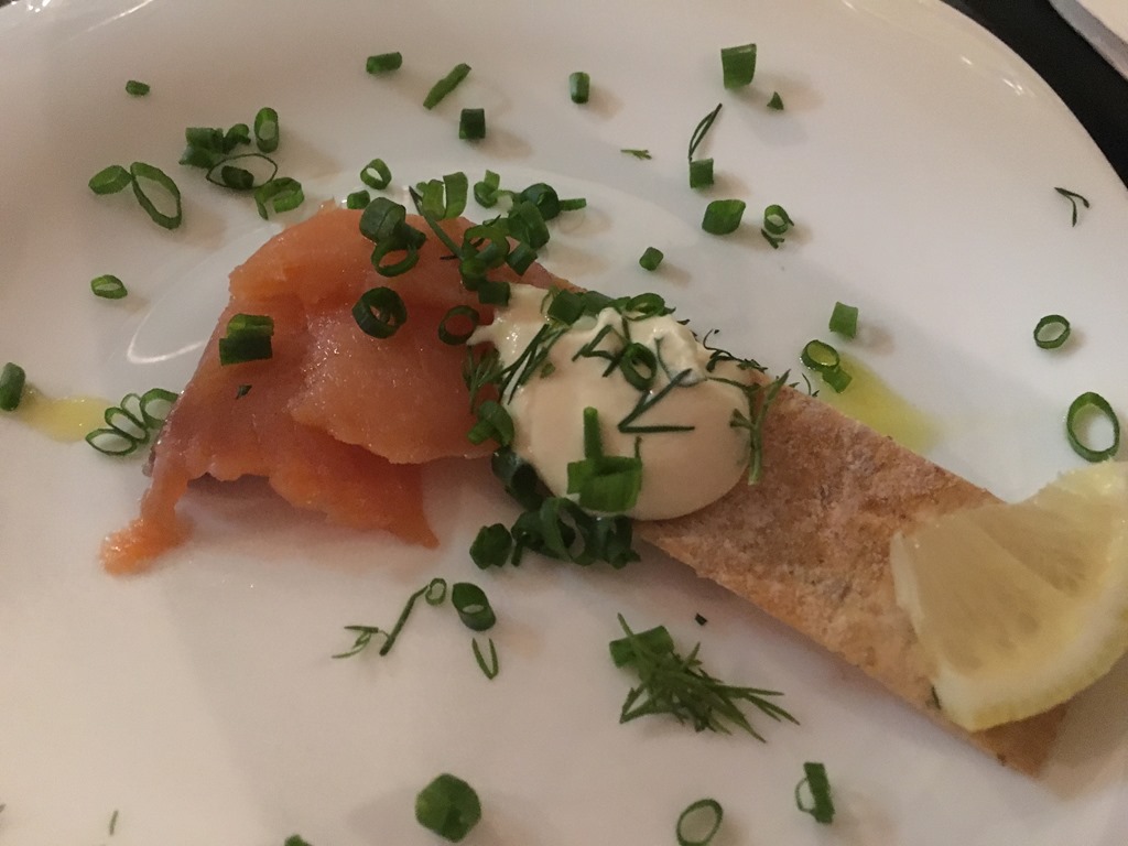 O chef Renato Quintino preparou um jantar harmonizado de 8 pratos invocando os 5 sentidos . Acima Blinis ao Caviar e Salmão Gravlax – 2 pratos tradicionais e fortes, harmonizados com o vinho branco correto . Sentimos cheiro de erva doce , limão e ainda tentávamos advinhar os sabores em cada prato. O jantar e o processo inteiro levou umas 4 horas .
